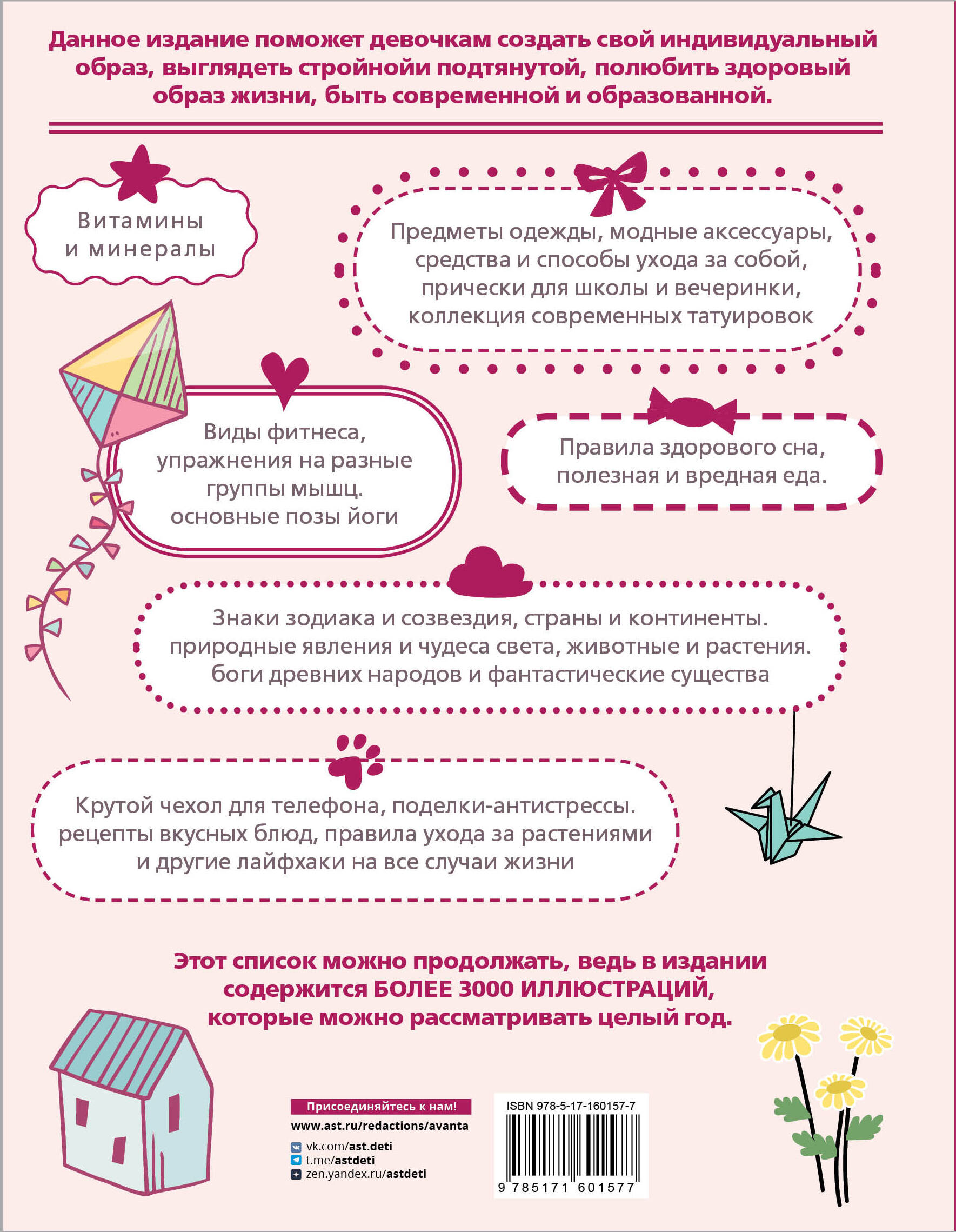 В настоящее время существуют самые разные энциклопедии, и большинство из них содержит огромное количество статей на заданную тему. Мы же предлагаем совсем другую книгу, которая состоит из множества красочных иллюстраций в сопровождении лаконичных подписей, поясняющих суть того или иного явления. Эта энциклопедия предназначена девочкам, ведь на ее страницах представлен визуальный ряд, который заинтересует именно их. Разные виды фитнеса, основные позы йоги, гардероб, аксессуары, прически, татуировки - здесь есть все, что поможет девочке создать собственный образ и сделать свое тело стройным и подтянутым. А умение делать своими руками чехол для телефона, различные поделки-антистрессы, приготовить самые вкусные блюда, научиться ухаживать за лицом и даже нарисовать слова в стиле леттеринг выгодно выделят юную особу среди сверстниц. Есть в книге и иллюстрации, которые помогут девочке сформировать представление об окружающем мире, что, несомненно, повысит ее интеллектуальный уровень. Список тем можно продолжать, ведь в издании содержится более 3000 иллюстрации, которые можно рассматривать целый год. Для среднего и старшего школьного возраста.| Издательство | Издательство "АСТ" |