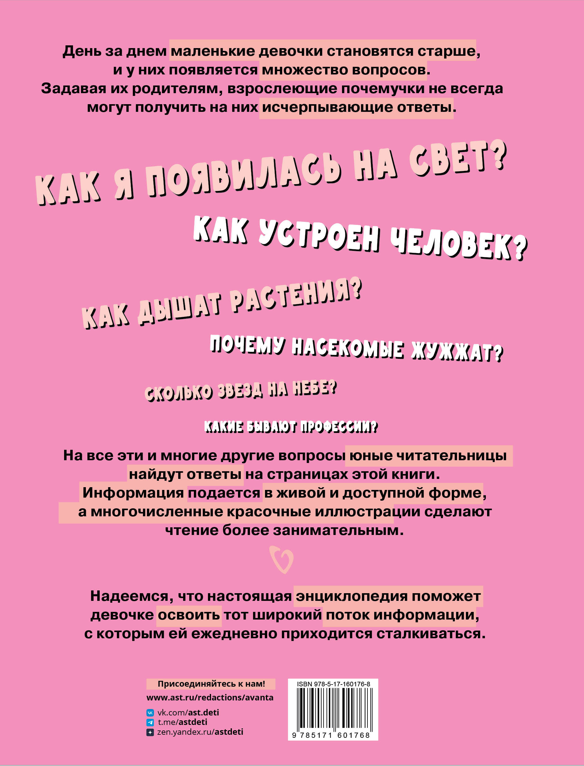 День за днем маленькие девочки становятся старше, и у них появ- ляется множество вопросов. Задавая их родителям, взрослеющие по- чемучки не всегда могут получить на них исчерпывающие ответы. Как я появилась на свет? Как устроен человек? Как дышат расте- ния? Почему насекомые жужжат? Сколько света на небе? Какие бы- вают профессии? На все эти и многие другие вопросы юные читатель- ницы найдут ответы на страницах этой книги. Информация подается в живой и доступной форме, а многочисленные красочные иллюстра- ции сделают чтение более занимательным. Надеемся, что настоящая энциклопедия поможет ребенку освоить тот широкий поток информации, с которым ему ежедневно приходит- ся сталкиваться. Для младшего школьного возраста.