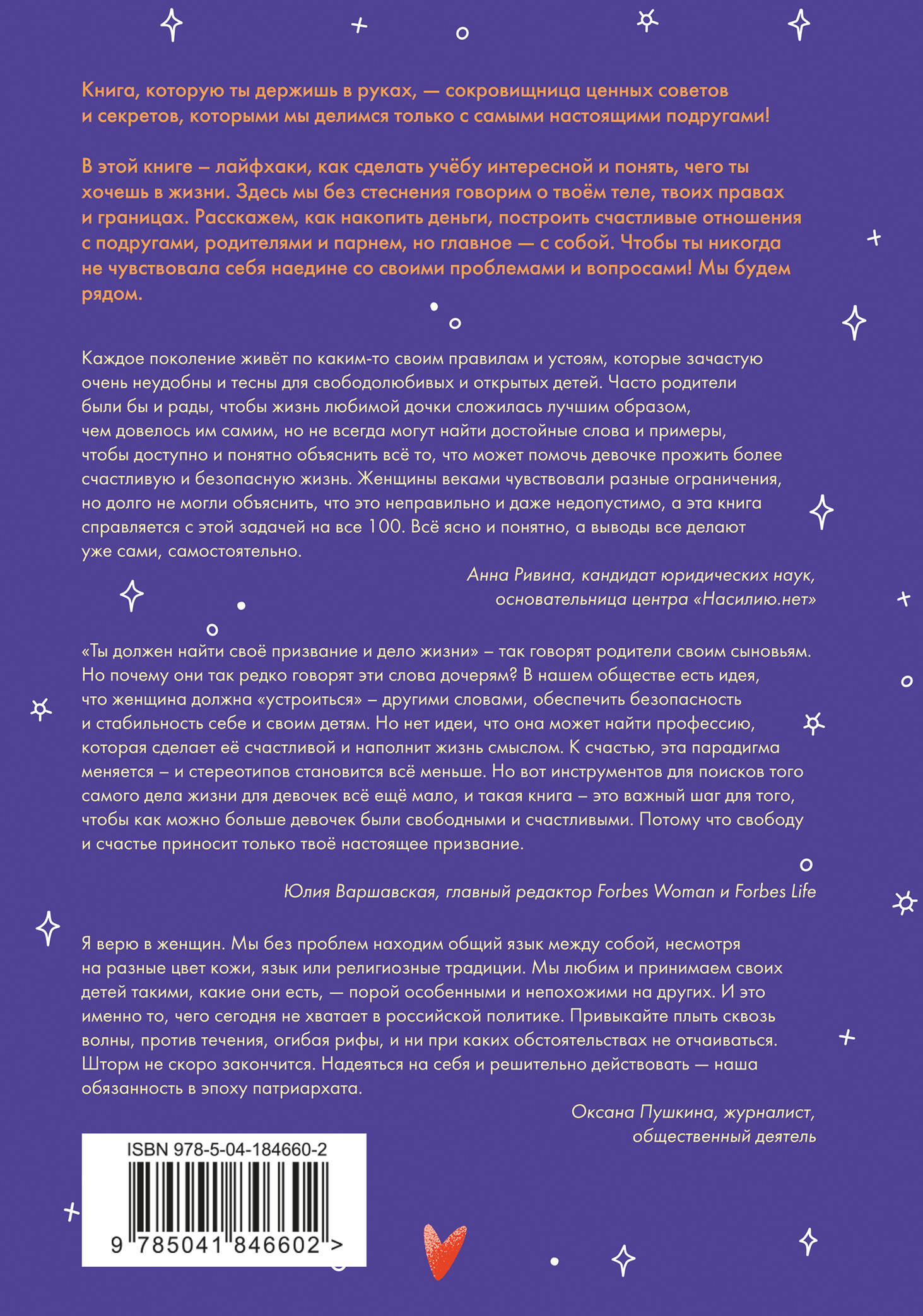 Книга, которую ты держишь в руках, - сокровищница ценных советов и секретов, которыми мы делимся только с самыми настоящими подругами! В этой книге лайфхаки, как сделать учёбу интересной и понять, чего ты хочешь в жизни. Здесь мы без стеснений говорим о твоём теле, твоих правах и границах. Расскажем, как накопить деньги, построить счастливые отношения с подругами, родителями и парнем, но главное - с собой. Чтобы ты никогда не чувствовала себя наедине со своими проблемами и вопросами! Мы будем рядом.