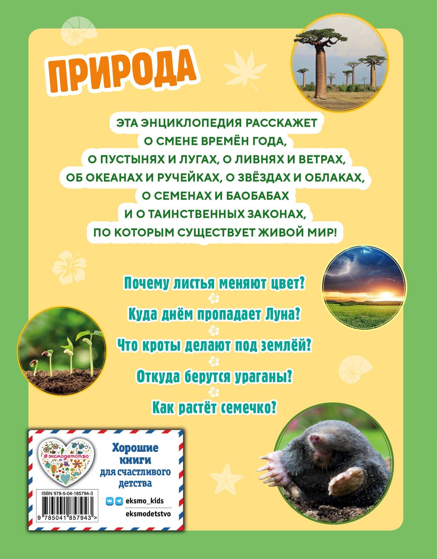 В этой красочной подарочной энциклопедии ребят ждёт необычайный мир природы нашей Земли! На каждом развороте - любопытные факты и большие яркие фотографии, которые помогут узнать много нового о временах года и сопровождающих их явлениях, таких как зимние морозы, весеннее солнышко, летняя жара и осенние листочки, о том, почему день сменяет ночь, о лесах и лугах, океанах и реках, о цветах, деревьях и других растениях и ещё многих-многих других уникальных природных явлениях. Книга предназначена для детей младшего школьного возраста.| Издательство | ООО "Издательство "Эксмо" |