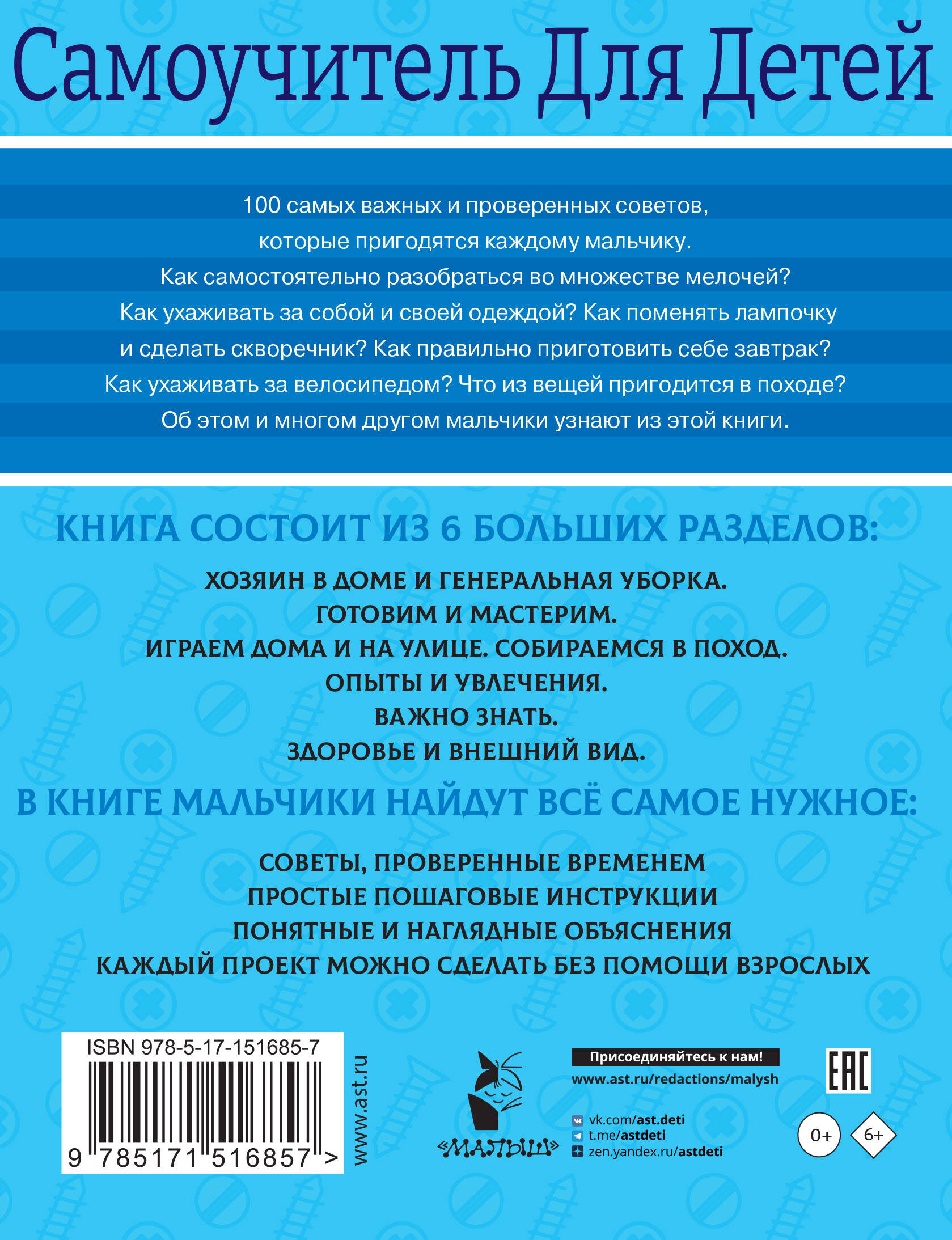 В данной книге, мальчики найдут всё самое нужное: 100 самых интересных и полезных советов, простые, пошаговые инструкции, понятные и наглядные объяснения. Мальчики быстро и с удовольствием научаться разбираться в инструментах, спортивных играх, здоровом питании. Узнают, как правильно и безопасно поменять лампочку; как смастерить скворечник. Научаться ухаживать за велосипедом; строить крепкий шалаш. Смогут разобраться в разных настольных играх и даже научаться делать свою собственную! Книга состоит из шести больших разделов: Хозяин в доме и генеральная уборка. Готовим и мастерим. Играем дома и на улице. Собираемся в поход. Опыты и увлечения. Важно знать. Здоровье и внешний вид. Мальчика ждут 100 пошагово проиллюстрированных инструкций на все случаи жизни!| Издательство | ИЗДАТЕЛЬСТВО "АСТ" |