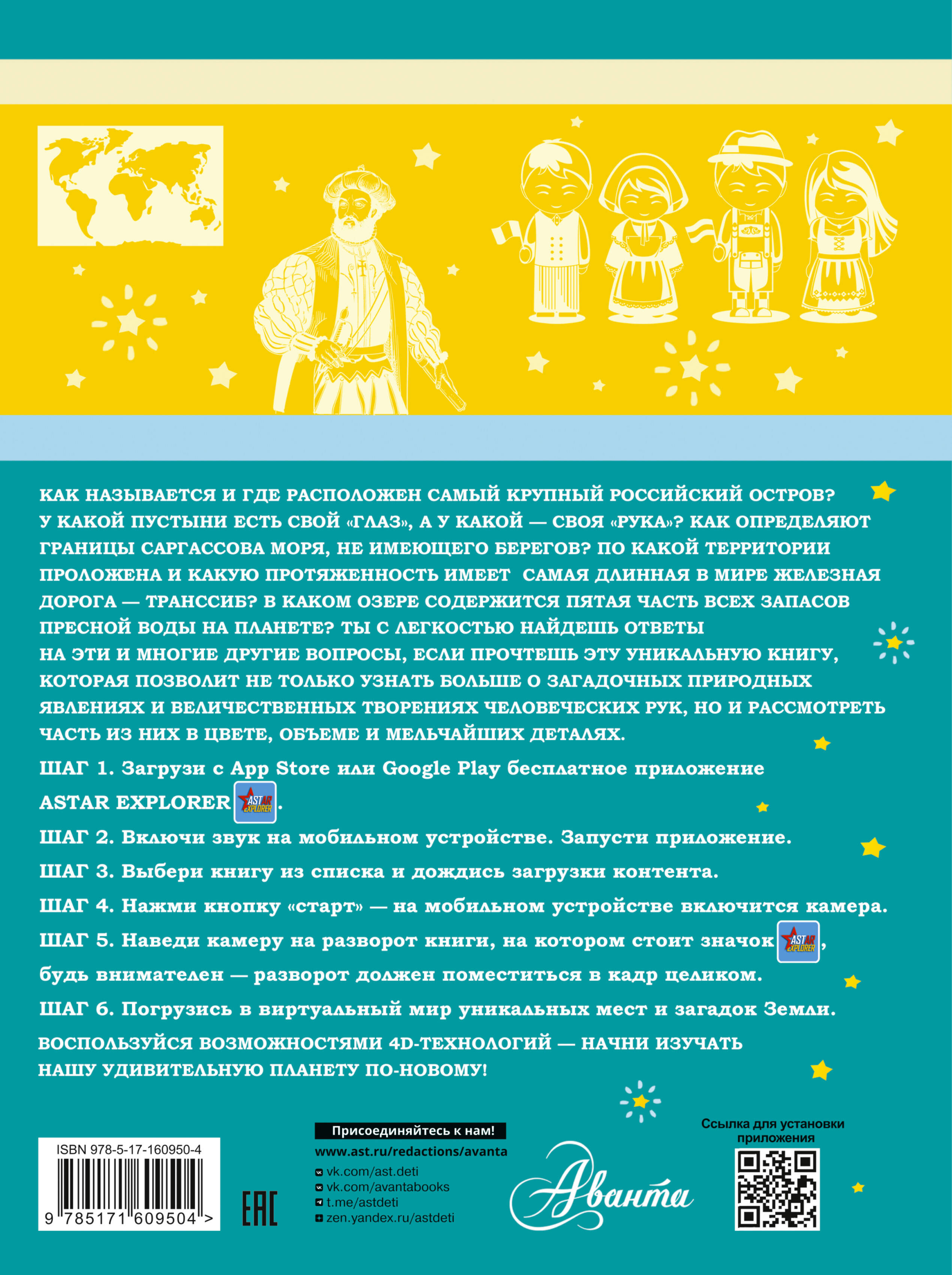 Ты хочешь знать, чем прославился Виллем Баренц, а чем - Иван Папанин? Как назывался первый в мире пилотируемый космический аппарат и кто из космонавтов первым в истории Земли совершил полет на таком аппарате? На дне какой пещеры течет река Эхо? Откуда возникает торнадо и как образуется цунами? Для чего строят плотины? Кого и где охраняла знаменитая терракотовая армия? Почему птицу тукана называют амазонским клоуном? В какой части планеты можно наблюдать до 28 молний в минуту? На страницах этого уникального атласа с наглядными картами и зрелищными иллюстрациями ты отыщешь массу полезной информации о морях и океанах, странах и континентах, народах мира и их самобытных традициях, удивительных растениях и животных, редких атмосферных явлениях и чудесах природы, исторических и культурных достопримечательностях разных уголков земного шара. Ты сможешь получить ответы на свои самые каверзные вопросы, а дополненная реальность в виде 40-анимаций, снабженных информативными звукозаписями, сделает твое кругосветное путешествие еще более увлекательным. Для среднего и старшего школьного возраста.