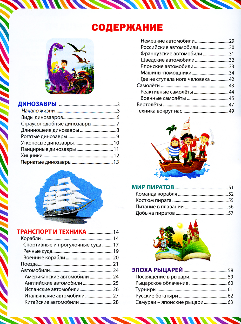 Уважаемые родители! На страницах красочной энциклопедии увлекательно рассказывается о древнем мире динозавров, о транспорте и технике, а также о пиратах и рыцарях. Читая нашу энциклопедию, ваш ребёнок сможет узнать много нового и интересного: чем панцирные динозавры отличаются от утконосых, какие бывают корабли, в какой стране производят больше всего автомобилей, кто такие пираты и как стать отважным рыцарем. А привлекательные иллюстрации не дадут ему скучать. Подарите вашему сыну лучшую энциклопедию с яркими картинками!| Издательство | Владис |