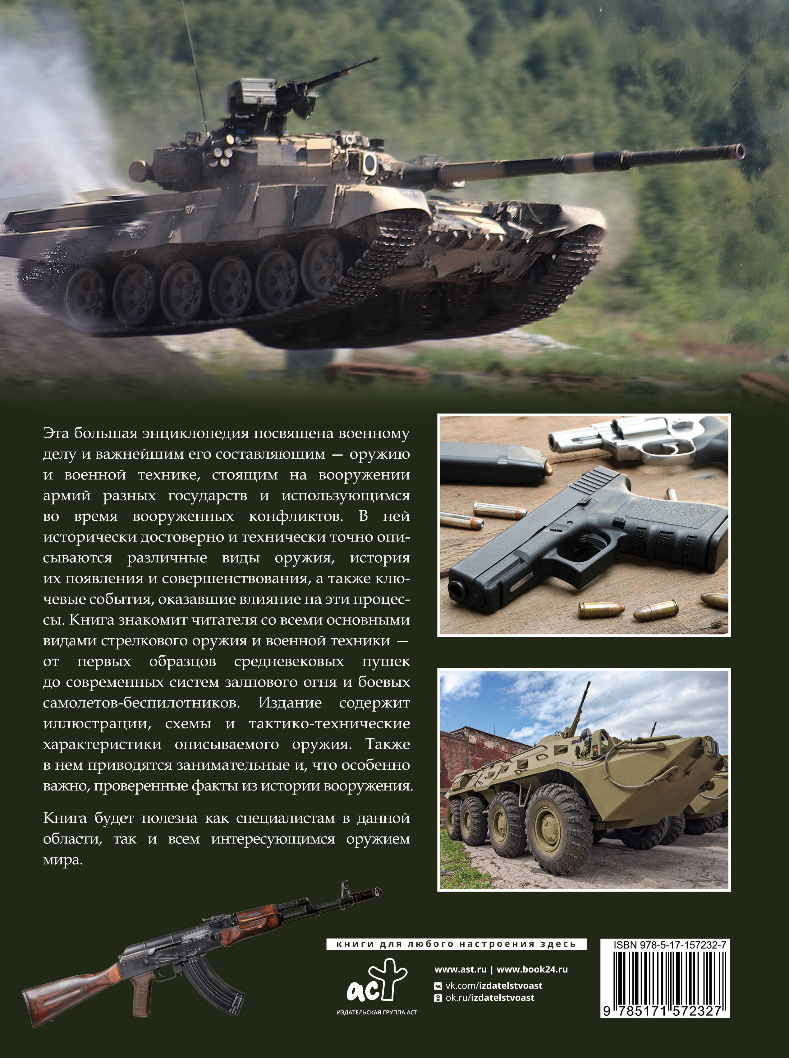 Эта большая энциклопедия посвящена военному делу и важнейшей его составляющей - оружию, которое использовалось армиями разных стран мира во время тех или иных военных конфликтов. Здесь исторически достоверно и технически точно описываются различные виды вооружения, история их появления и совершенствования, а также ключевые события, оказавшие влияние на эти процессы. Книга знакомит читателя со всеми основными видами стрелкового оружия и боевой техники - от первых образцов средневековых пушек до современных самолетов-беспилотников. Издание содержит иллюстрации и схемы, тактико-технические характеристики образцов оружия, а также занимательные факты из истории вооружения. Книга будет полезна как специалистам в данной области, так и всем интересующимся оружием мира.| Издательство | ИЗДАТЕЛЬСТВО "АСТ" |