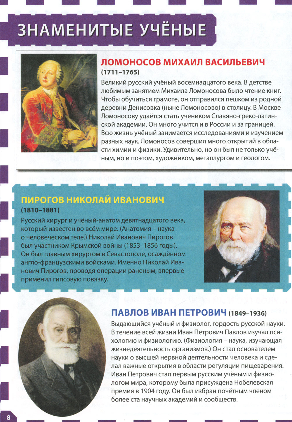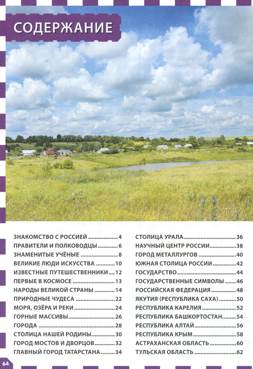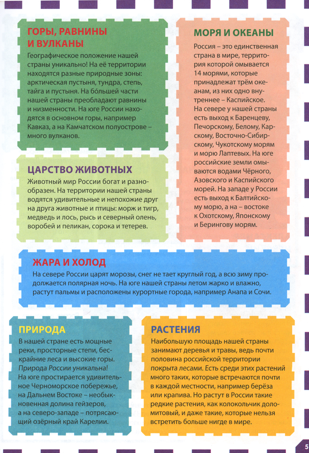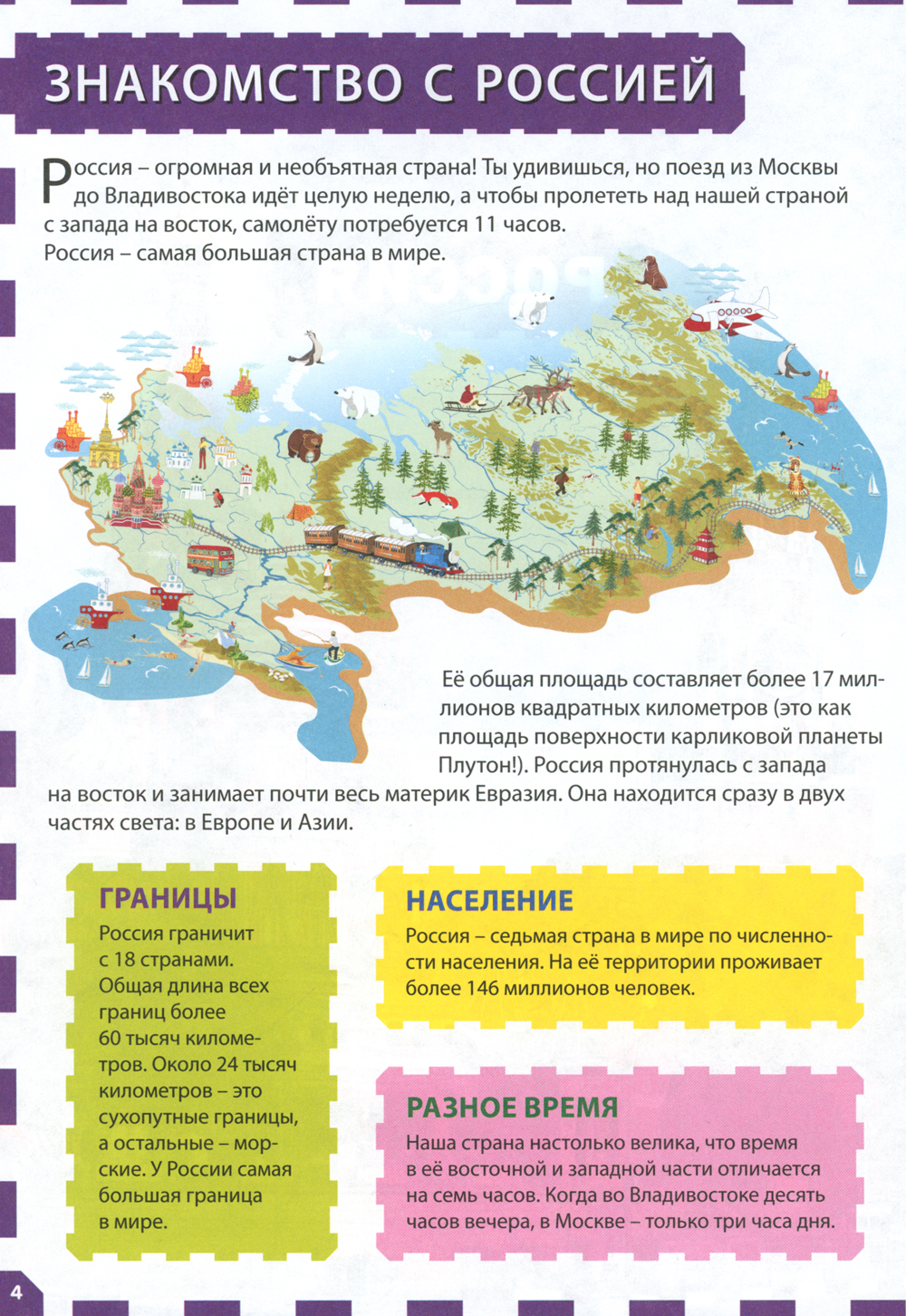 Дорогой друг! Давай отправимся в увлекательное путешествие по просторам нашей необъятной Родины: по рекам и морям, горам и лесам, большим городам и разным республикам! Из этой красочной энциклопедии ты узнаешь, кто основал Санкт-Петербург, город дворцов и мостов, сколько народов живёт в России, чем знаменита Камчатка, где проходит граница между Европой и Азией, как попасть в музей Солнца и многое другое... Поскорей открывай книгу - и в путь!| Издательство | Владис |