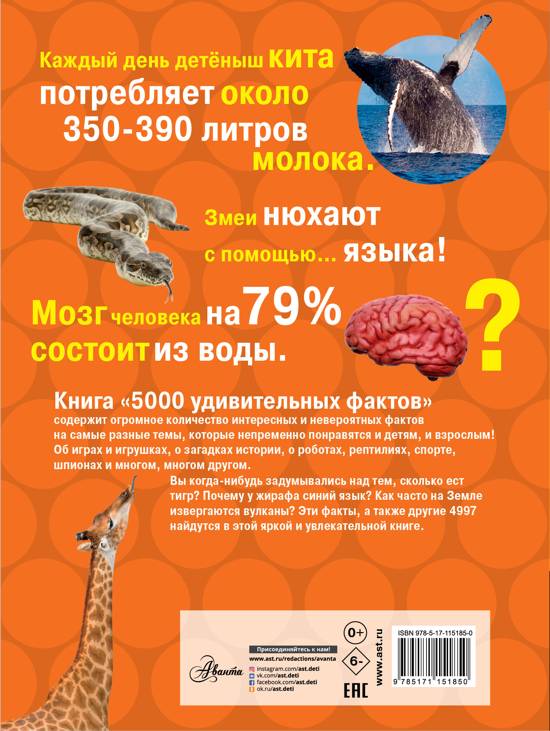 Энциклопедия "5000 удивительных фактов (Обо всём на свете!) наполнена самыми разнообразными фактами. Невероятными и забавными, поразительными и странными, познавательными и полезными, но главное - интересными! В книге множество ярких и красивых фотографий, а каждый разворот посвящен отдельной теме, потому читать ее просто и увлекательно. Знали ли вы, что о шоколаде можно собрать столько интересных фактов? Факты об акулах, факты о динозаврах, факты о космических открытия, факты об играх и игрушках, факты о животных, факты о спорте и многом, многом, многом другом! В книге действительно есть факты обо всем на свете! Для среднего школьного возраста.| Издательство | Издательство "АСТ" |