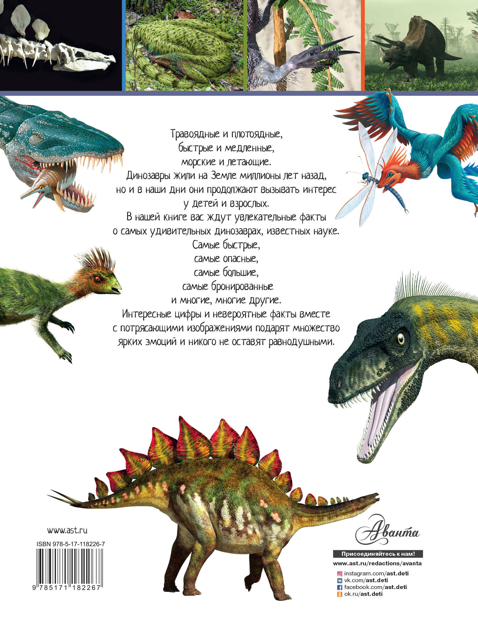 Динозавры правили Землёй миллионы лет и сегодня они всё еще поражают наше воображение: не только внешним видом, но и невероятными способностями. В книге "Динозавры" из серии "Энциклопедия удивительных фактов" собраны самые быстрые, самые свирепые, самые огромные, самые бронированные и даже самые пушистые динозавры! Читатель повстречает гигантского амфицелия, супербыстрого струтиомима, спинозавра - самого крупного двуногого хищника всех времён, и многих, многих других. В книге есть множество забавных фактов и интересных цифр, временная шкала, сравнение каждого динозавра с размерами взрослого человека, а также информация о том, где и когда жил динозавр, чем питался и насколько был опасен. Автор книги - Доктор Даррен Нейш - палеонтолог и писатель, он специализируется на динозаврах и доисторических существах. И когда он не занят раскопками динозавров и древних рептилий, он пишет о них! Для среднего школьного возраста.| Издательство | ИЗДАТЕЛЬСТВО "АСТ" |