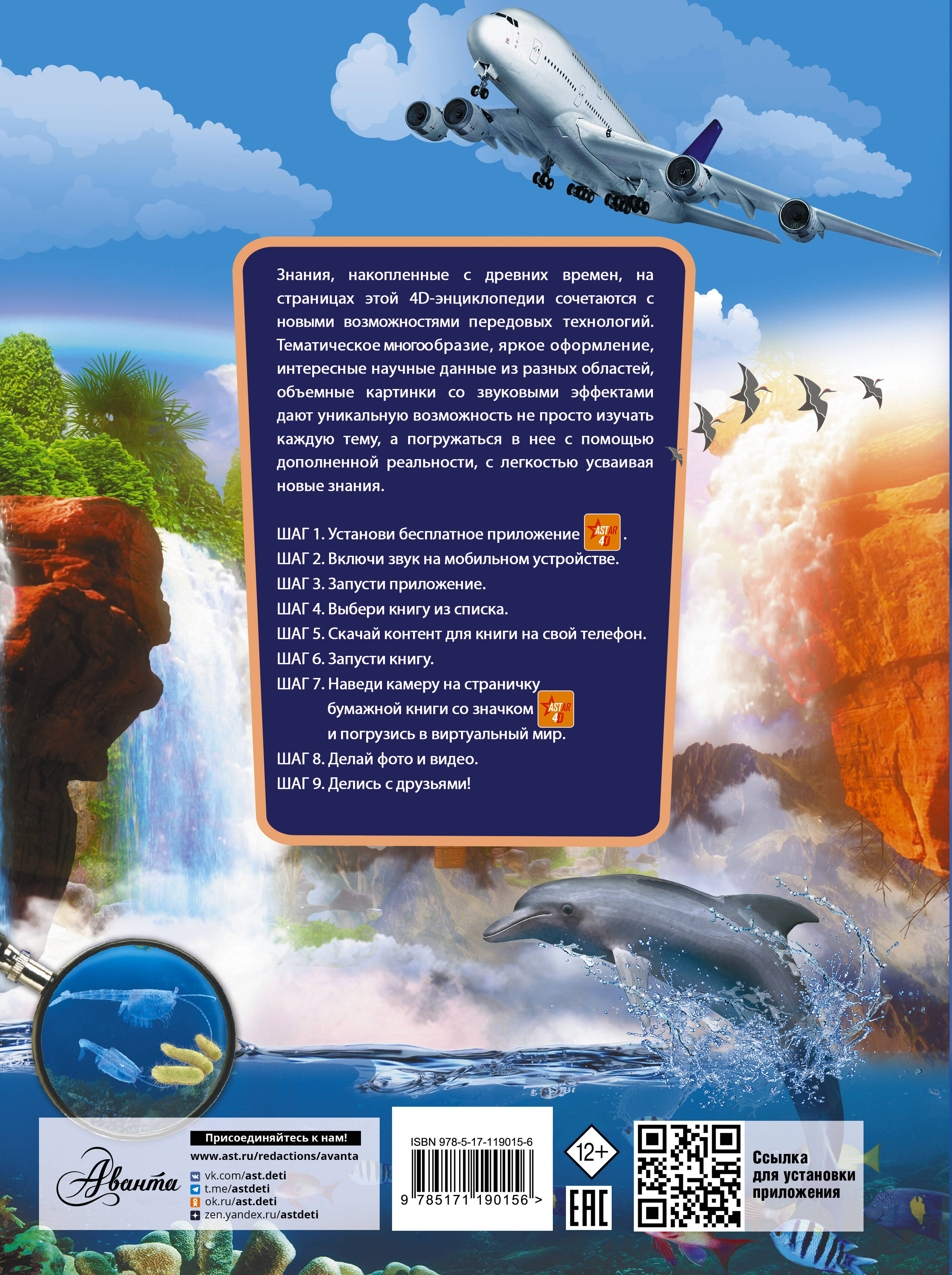 Эта развивающая 4D-энциклопедия с элементами дополненной реальности приводит разносторонние сведения из различных областей знаний, тем самым помогая глубже изучить окружающий мир в его многообразии. Образование Вселенной, зарождение жизни, эволюция и естественный отбор, возникновение человека, анатомия и физиология, технический прогресс и исследование космоса - яркий рассказ обо всем этом впечатляет и вызывает желание провести собственный научный эксперимент. И книга дает читателю такую возможность: здесь имеются описание и анимация несложных, но полезных познавательных опытов. А благодаря использованию технологий дополненной реальности иллюстрации на этих страницах можно изучить не только в цвете, но и в объеме, движении и со звуковыми эффектами. Издание расширяет кругозор и помогает лучше познать мир, в котором мы живем. Для среднего и старшего школьного возраста.| Издательство | ИЗДАТЕЛЬСТВО "АСТ" |