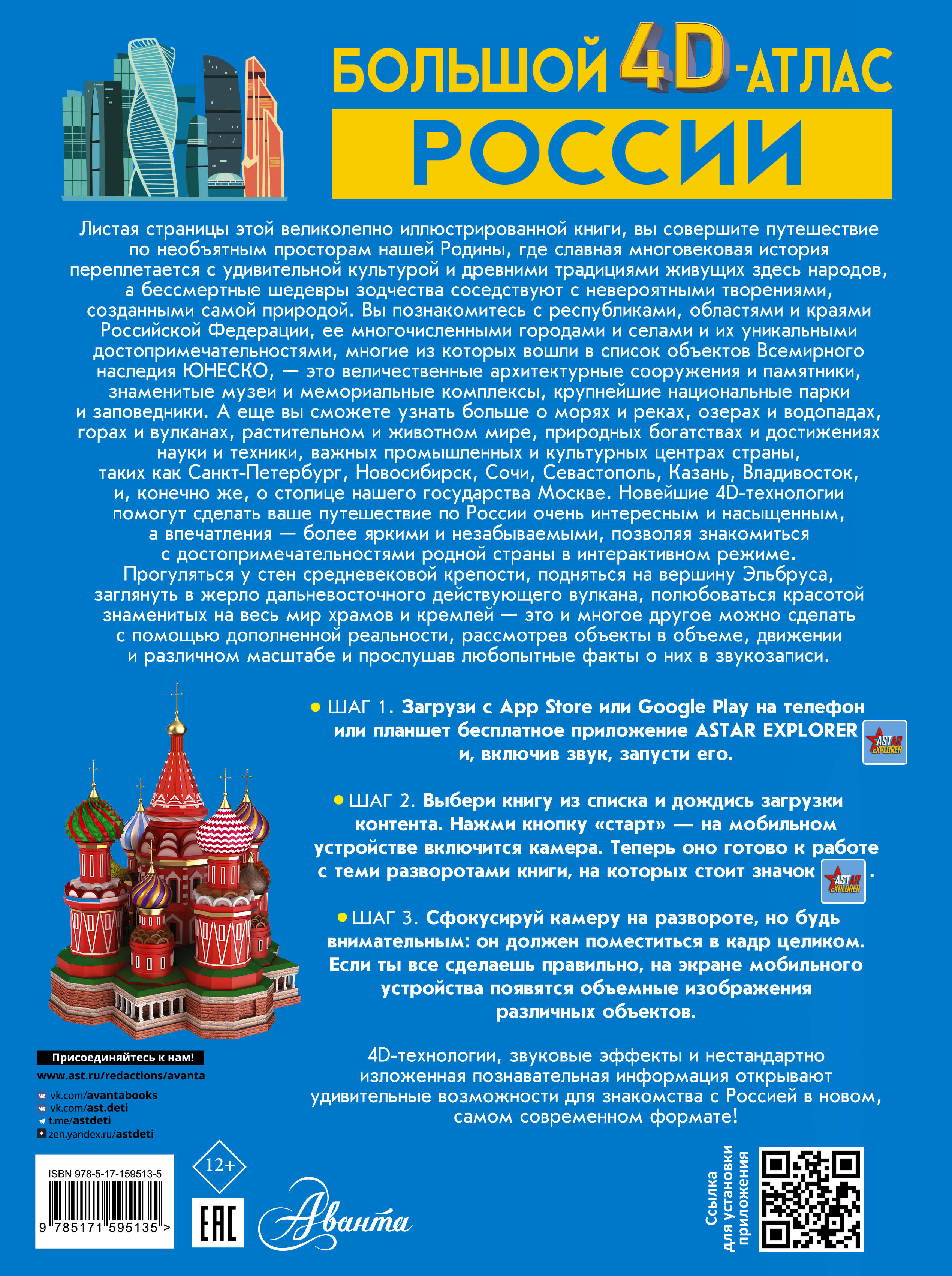 Большой 40-атлас станет вашим гидом в увлекательном путешествии по России. Он расскажет о республиках, краях и областях Российской Федерации, ее крупнейших мегаполисах, таких как столица нашей Родины Москва, главный культурный центр Санкт-Петербург, самый большой город Сибири Новосибирск, краса и гордость Татарстана Казань и многих других. Здесь же содержится интересная информация о городах поменьше, входящих в список "Золотое кольцо России", а также древних селениях, ставших музеями под открытым небом. Вы сможете лучше изучить географию нашей страны, ее растительный и животный мир, природные богатства, достижения науки и техники. Важные сведения и любопытные факты в этой книге приведены в сопровождении огромного количества зрелищных иллюстраций, позволяющих позна- комиться с величественными православными храмами и мусульманскими мечетями, великолепными дворцами, неприступными средневековыми башнями и боевыми крепостями, самыми протяженными мостами и грандиозными дамбами, загадочными дольменами и мистическими скальными образованиями, таинственными пещерами и огнедышащими вулканами, высочайшими горными пиками и красивейшими водопадами, удивительными обитателями живой природы и впечатляющими образцами отечественной техники. Но главное - использование новейших 4D-технологий позволит рассмотреть многочисленные природные, культурные и исторические достопримечательности нашей страны со всех сторон, в цвете и объеме, а познавательные сообщения о них прослушать в звукозаписи. Для этого вам нужно будет лишь скачать бесплатное приложение ASTAR EXPLORER и действовать согласно несложной инструкции. Дополненная реальность, звуковые эффекты и нестандартно изложенная информация откроют удивительные возможности для изучения географии, истории, культуры, науки и мира живой природы России по-новому. Для среднего и старшего школьного возраста.| Издательство | Издательство "АСТ" |