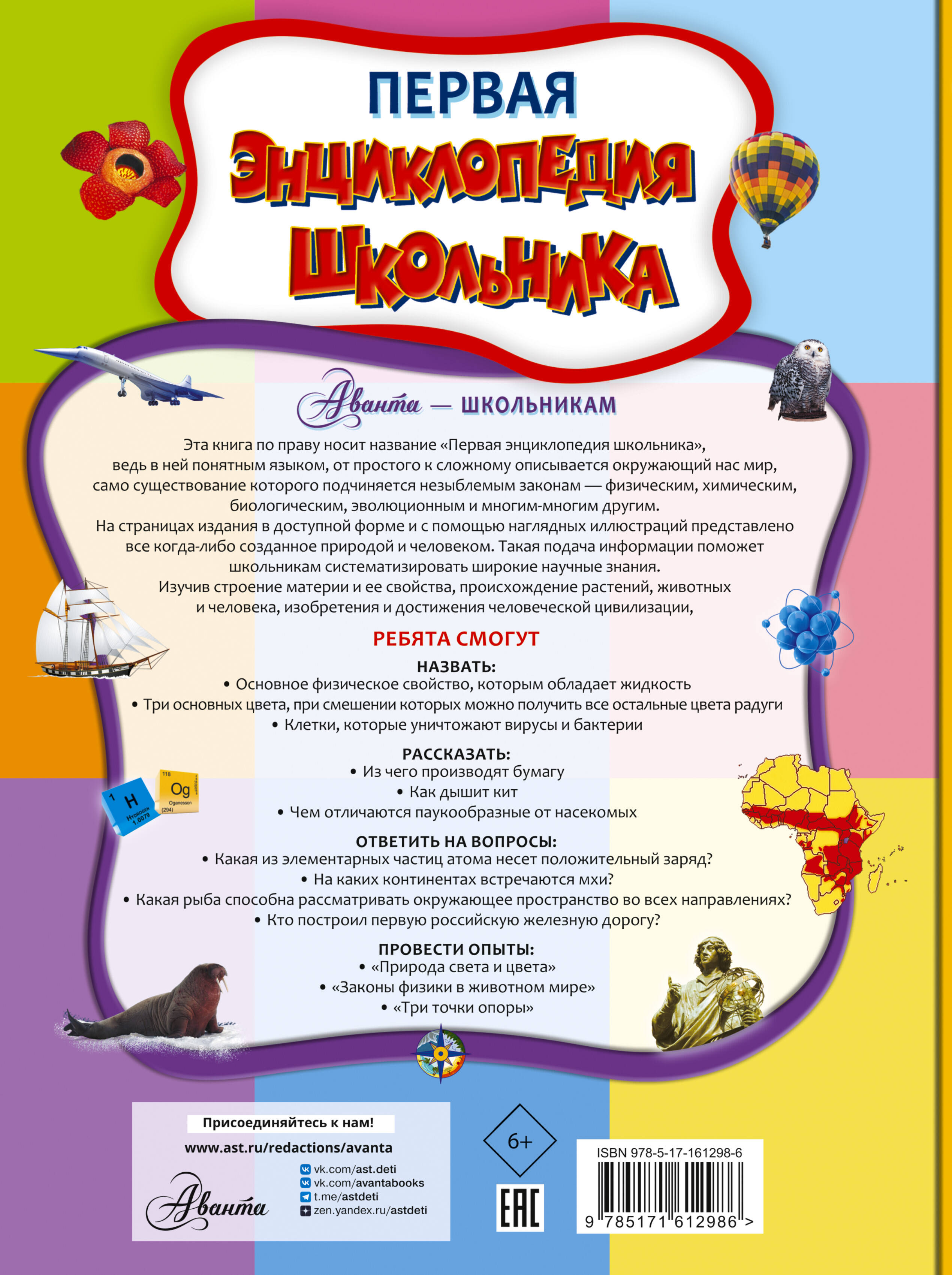 Эта весьма информативная и увлекательная книга недаром названа "Первой энциклопедией школьника". С чего ученики в любой стране мира начинают изучать окружающий мир? Правильно - с азов. А это означает, что данное издание поможет юному читателю пройти путь познания от простого к сложному. В первом разделе на интересных примерах рассказывается о строении вещества, атомах и молекулах, основных химических элементах, а также о таких физических понятиях, без которых существование нашего мира невозможно: о свойствах энергии, света и цвета, теплоты, звука, магнетизма и многом другом. В разделах, описывающих растения и животных, школьник узнает о зарождении и развитии жизни на нашей планете, о древнейших и современных обитателях Земли, их уникальных особенностях. Венцом эволюционного развития является человек, и завершающие разделы книги повествуют о том, как он появился, с подробным описанием анатомии и физиологии этого уникальнейшего во Вселенной мыслящего существа. А окончательно сформировали облик Земли замечательные открытия человеческой цивилизации: от укрощения огня и изобретения колеса до автомобилей и самолетов, мобильных телефонов и компьютеров - все самые знаковые достижения современной науки также представлены на страницах издания. Информация доступно излагается при помощи увлекательных описаний, приводится много интересных и любопытных научных фактов, а наглядные иллюстрации в подробностях раскрывают тайны мироздания. Кроме того, ребятам предлагается собственноручно провести несколько нехитрых, но весьма познавательных физических опытов, чтобы на практике убедиться в действенности незыблемых законов науки. А для закрепления полученных знаний и самопроверки к каждому разделу подготовлены вопросы: узнав ответы на них, школьники не только расширят свой кругозор, но и будут уверенно чувствовать себя на уроках, ведь практически все рассмотренные темы изучаются в рамках школьной программы.| Издательство | Издательство "АСТ" |