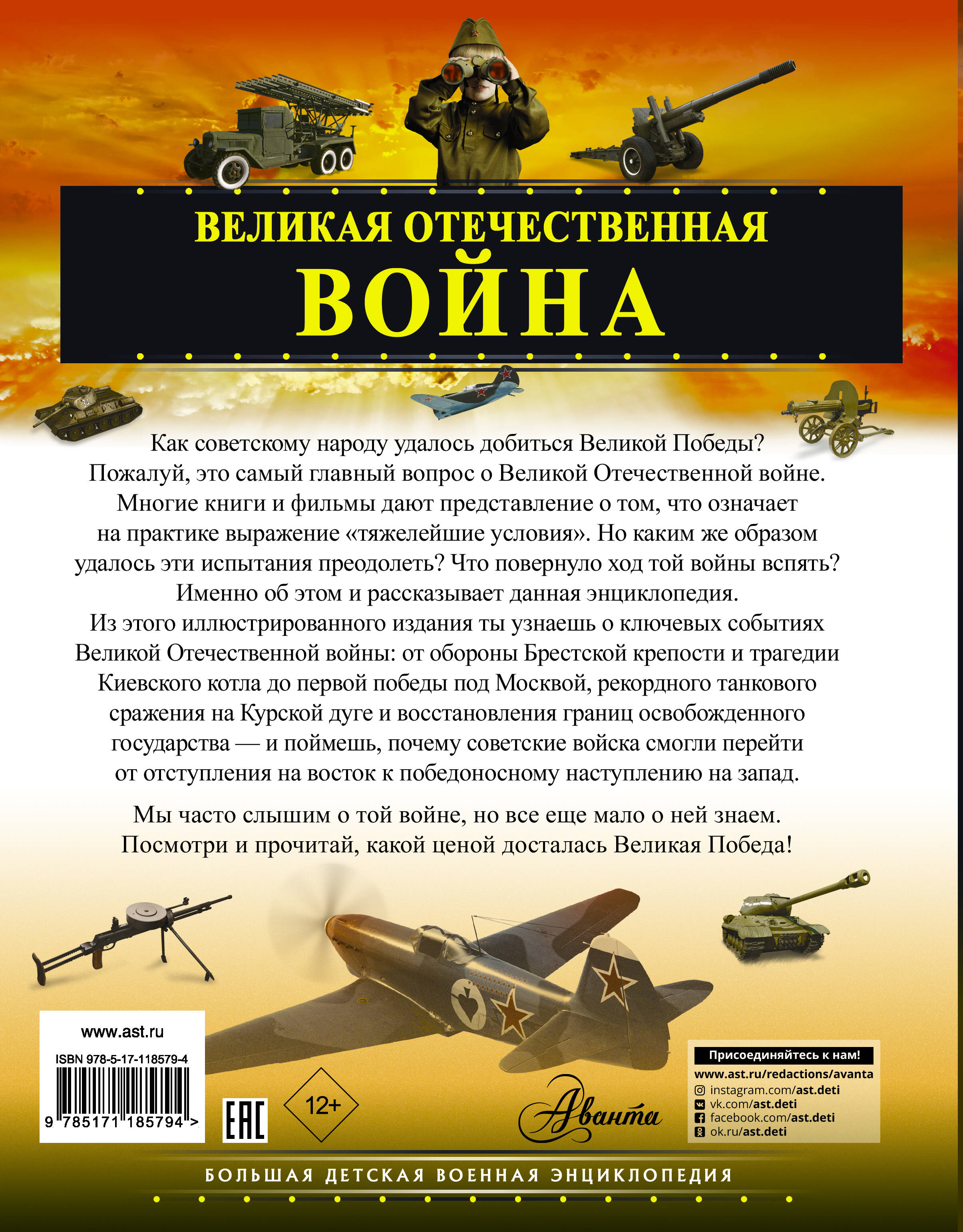 Как советскому народу удалось добиться Великой Победы? Пожалуй, это самый главный вопрос о Великой Отечественной войне. Многие книги и фильмы дают представление о том, что означает на практике выражение"тяжелейшие условия". Но каким же образом удалось эти испытания преодолеть? Что повернуло ход той войны вспять? Именно об этом и рассказывает данная энциклопедия.Из этого иллюстрированного издания ты узнаешь о ключевых соытиях Великой Отечественной войны: от обороны Брестской крепости и трагедии Киевского котла до первой победы под Москвой, рекордного танкового сражения на Курской дуге и восстановления границ освобожденного государства - и поймешь, почему советские войска смогли перейти от отступления на восток к победоносному наступлению на запад. Мы часто слышим о той войне, но все еще мало о ней знаем. Посмостри и прочитай, какой ценой досталась Великая Победа!| Издательство | Издательство "АСТ" |