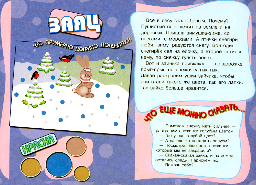 Прекрасный сборник для творчества в 2-3 года, пока цельная картина ещё выходит не очень, а сотворчество с художником - очень даже эффектно и эффективно. Пробуйте и удивляйтесь! Прежде чем рисовать в книжке с ребенком, просмотрите ее сами. Понятно, что картинки в книжке предназначены для рисования пальчиками. Обратите внимание на пояснительные странички к иллюстрациям. На них расположены: - Сопроводительные тексты, которые помогут вам заинтересовать ребенка иллюстрацией и рисованием в ней. Введение в ситуацию крайне желательно для создании мотивации к последующей работе. Каждый основной текст-презентацию дополняем фразами (под рубрикой "Что еще можно сказать"), которые мы рекомендуем употреблять уже в процессе творческого порыва. - На этих же страничках в левом нижнем углу нарисованы четыре баночки с красками. Это значит, что мы работаем в пределах четырех цветов. Этого вполне достаточно для увлекательного рисования в этом возрасте.| Издательство | ИД Карапуз |