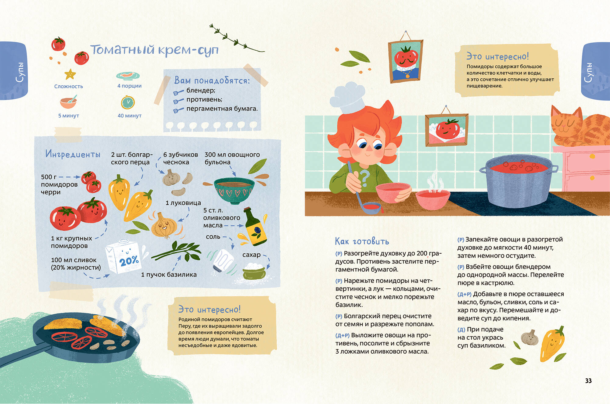 Сборник вкусных рецептов, которые помогут ребенку научиться готовить вместе с любимым героем Чевостиком. В книге вы найдете 38 рецептов: сырники, нежные блинчики в шоколадном соусе, паста с сыром, пицца, картофель по-деревенски, нежный чизкейк, ягодный лимонад и многие другие. Пошаговые рецепты с подсказками и полезными советами помогут юным кулинарам с легкостью освоиться на кухне, а родителям - с пользой провести время вместе с детьми. Рецепт каждого блюда разбит на отдельные шаги: для взрослых, детей и совместной работы, поэтому ребенок сможет активно участвовать в процессе приготовления и делать то, что ему под силу. А еще на страницах книги вы найдете интересные факты о продуктах и истории блюд. Ваш маленький непоседа поймет, что вкусно готовить могут не только взрослые. А еще это очень весело и увлекательно! Фишки книги: - Вкусные и простые рецепты блюд современной кухни для всей семьи. - Увлекательные факты о продуктах и истории блюд. - Пошаговые рецепты, которые помогут ребенку научиться готовить. - Рецепты постепенно усложняются - в начале каждого раздела самые простые блюда, в конце - более сложные. Сложность рецепта отмечена звездочками. - Для начинающих кулинаров есть подсказки и полезные советы. - Книга не только полезная, но и очень красивая! Симпатичные иллюстрации с милыми героями поднимают настроение. Их хочется разглядывать бесконечно! Как читать книгу: Все рецепты в книге пошаговые с подробным описанием действий, необходимых ингредиентов и инвентаря. Для каждого рецепта указано: сложность (самые простые блюда, отмеченные одной звездочкой, ребёнок сможет приготовить сам под наблюдением родителей); количество порций; время "холодного" приготовления блюда; время тепловой обработки. Каждый пункт инструкции по приготовлению маркирован одним из условных обозначений: Д - делают дети Р - выполняют родители Д+Р - делают дети с помощью родителей Для кого эта книга: Для юных кулинаров от 5 лет и старше. Для родителей, которые хотят интересно и с пользой проводить время с детьми. Для детей, которые хотят угостить взрослых и друзей вкусными блюдами. Для родителей, которые мечтают открыть в детях кулинарный талант и научить их самостоятельности.| Издательство | МАНН, ИВАНОВ И ФЕРБЕР ООО |