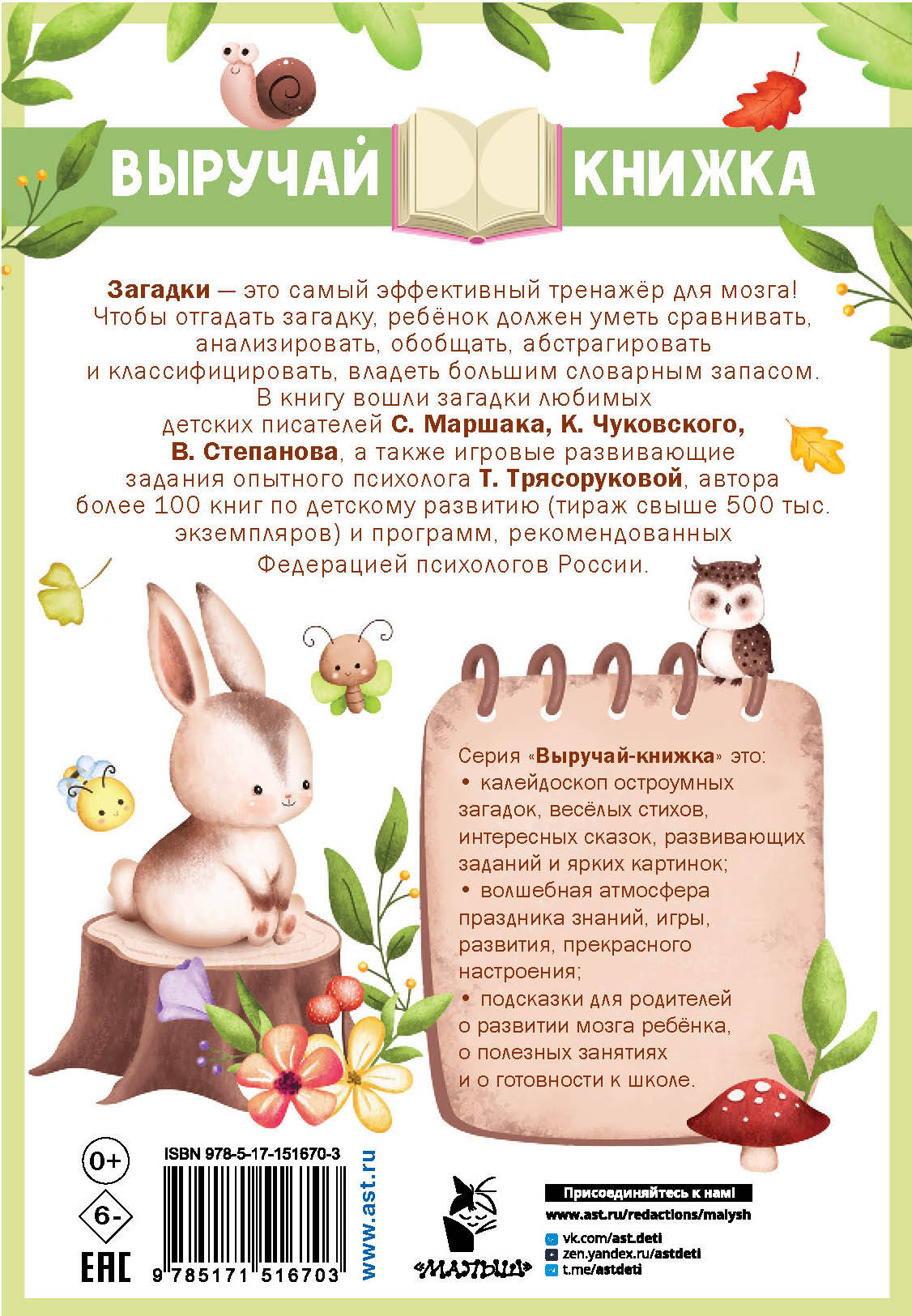 Загадки - это самый эффективный тренажёр для мозга! Чтобы отгадать загадку, ребёнок должен уметь сравнивать, анализировать, обобщать, абстрагировать и классифицировать. Ему понадобится большой словарный запас. В эту выручай-книжку вошло более 100 лучших загадок любимых детских писателей С. Маршака, К. Чуковского, В. Степанова, а также игровые развивающие задания опытного психолога Т. Трясоруковой. Подготовка к школе должна быть интересной!| Издательство | Издательство "АСТ" |