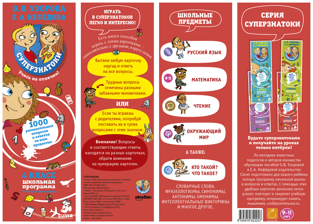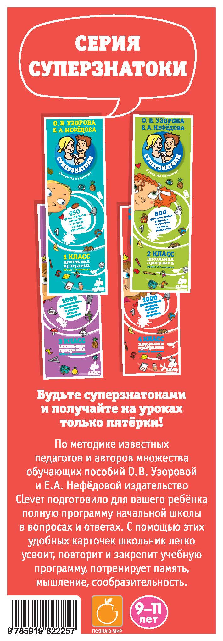 По методике известных педагогов и авторов множества обучающих пособий О.В. Узоровой и Е.А. Нефёдовой издательство Clever подготовило для вашего ребёнка полную программу начальной школы в вопросах и ответах. С помощью этих удобных карточек школьник легко усвоит, повторит и закрепит учебную программу, потренирует память, мышление, сообразительность.