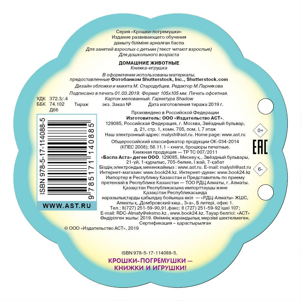 Книжка о домашних животных для самых маленьких читателей! Звонкая погремушка, прикрепленная к книге специальным шнурком, привлечет малыша и поможет удержать его внимание. Красочные и реалистичные картинки познакомят малыша с домашними животными, помогут запомнить их имена. Страницы выполнены из плотного картона, устойчивого к разрывам и повреждениям - ребёнок сможет сам листать книжку и рассматривать рисунки. Книга предназначена для детей в возрасте до двух-трёх лет, развивает память, слуховое и зрительное восприятие, мелкую моторику.| Издательство | ИЗДАТЕЛЬСТВО "АСТ" |