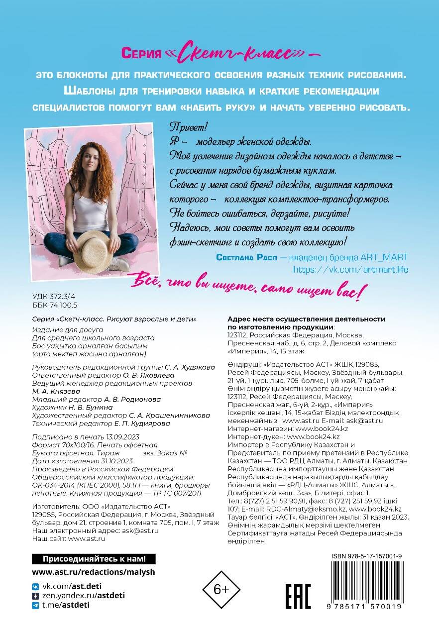 Серия "Скетч-класс" - это блокноты для практического освоения разных техник рисования. Шаблоны для тренировки навыка и краткие рекомендации специалистов помогут вам "набить руку" и начать уверенно рисовать. Скетч-блокнот "Fashion" научит вас азам фэшн рисунка и познакомит с основными правилами и понятиями дизайна одежды. 1. Стильный и компактный 2. Максимально удобный формат для набросков, навивка, плотная бумага. 3. 30 советов профессионального модельера 4. 60 шаблонов женских фигур для создания модных образов 5. Словарь фэшн-терминов и слов, которые необходимо знать начинающему дизайнеру.| Издательство | Издательство "АСТ" |