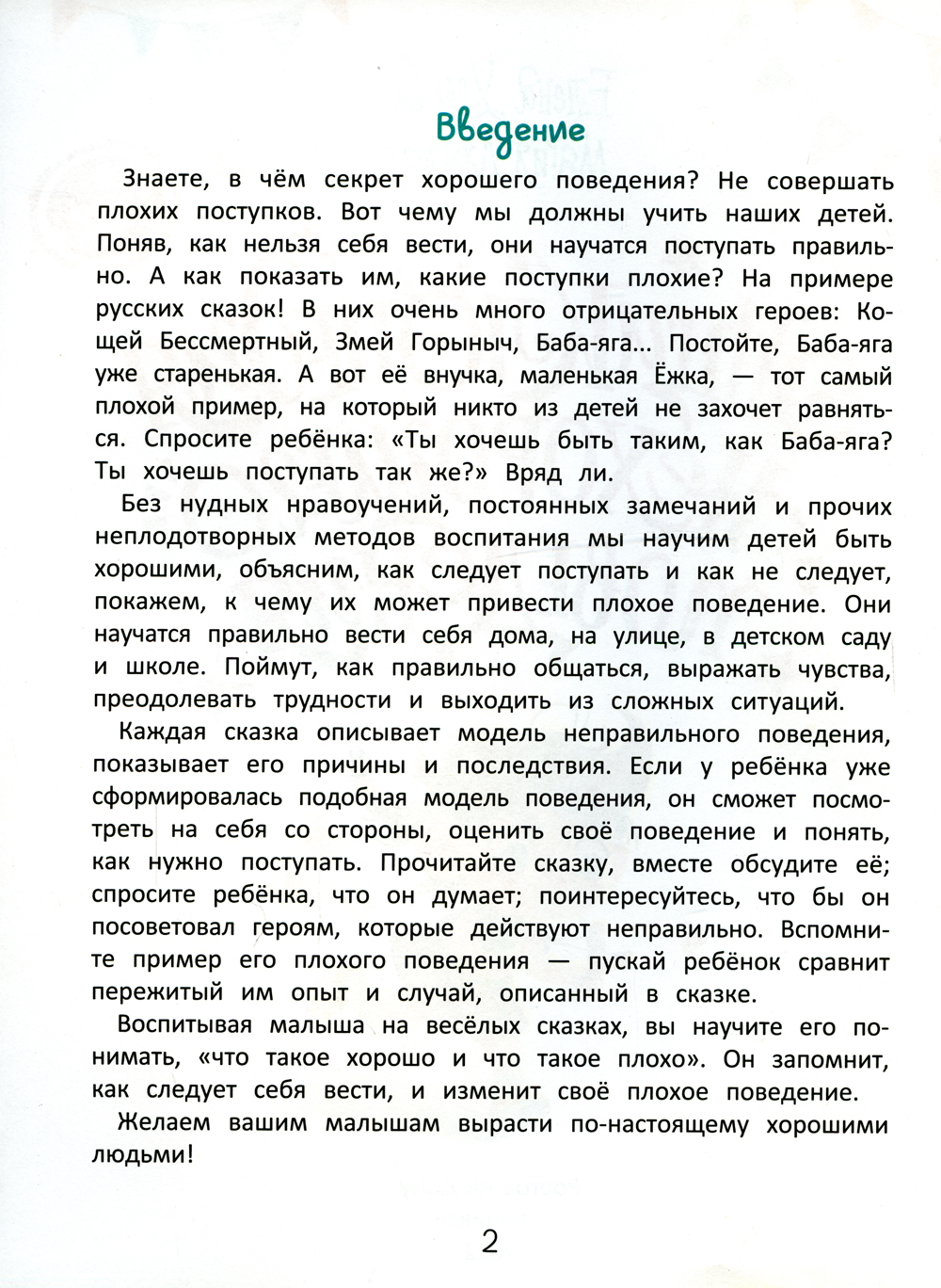 Знаете, в чём секрет хорошего поведения? Не совершать плохих поступков. Вот чему мы должны учить наших детей. Поняв, как нельзя себя вести, они научатся поступать правильно. А как показать им, какие поступки плохие? На примере отрицательных героев русских сказок! Маленький читатель познакомится с внучкой Бабы-яги - тоже Бабой-ягой, только маленькой - бабкой Ёжкой, которая проказничает как взрослая! Без нравоучений, постоянных замечаний и прочих неплодотворных методов воспитания мы научим детей быть хорошими, объясним, как следует поступать и как не следует, покажем, к чему их может привести плохое поведение. Они научатся правильно вести себя дома, на улице, в детском саду и школе. Поймут, как правильно общаться, выражать чувства, преодолевать трудности и выходить из сложных ситуаций. Воспитывая малыша на весёлых сказках, вы научите его понимать, «что такое хорошо и что такое плохо». Он запомнит, как следует себя вести, и изменит своё плохое поведение. Желаем вашим малышам вырасти по-настоящему хорошими людьми!