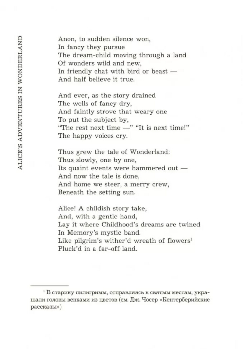 Сказки Льюиса Кэрролла «Алиса в Стране Чудес» и «Алиса в Зазеркалье» известны во всем мире. Иронизируя над шаблонами мышления, автор дал насмешливое изображение нравов английского общества Викторианской эпохи. Книги о приключениях маленькой подруги Кэрролла вошли в список двенадцати самых английских предметов и явлений,составленный министерством культуры, спорта и СМИ Великобритании, а имя Алиса стало популярным во всем мире.| Издательство | Каро |