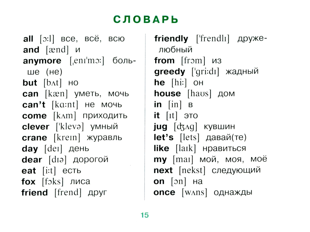 Книга входит в серию иллюстрированных учебных пособий «Читаем вместе». В русской народной сказке говорится о хитрой лисе, которая попыталась обмануть своего друга - журавля и получила по заслугам. Прочитав сказку, ребёнок познакомится с простым настоящим временем (Present Simple), научится использовать глагол like, поймёт разницу между предлогами on и in. Издание адресовано учащимся 2-3 классов школ и гимназий.| Издательство | Айрис-Пресс |