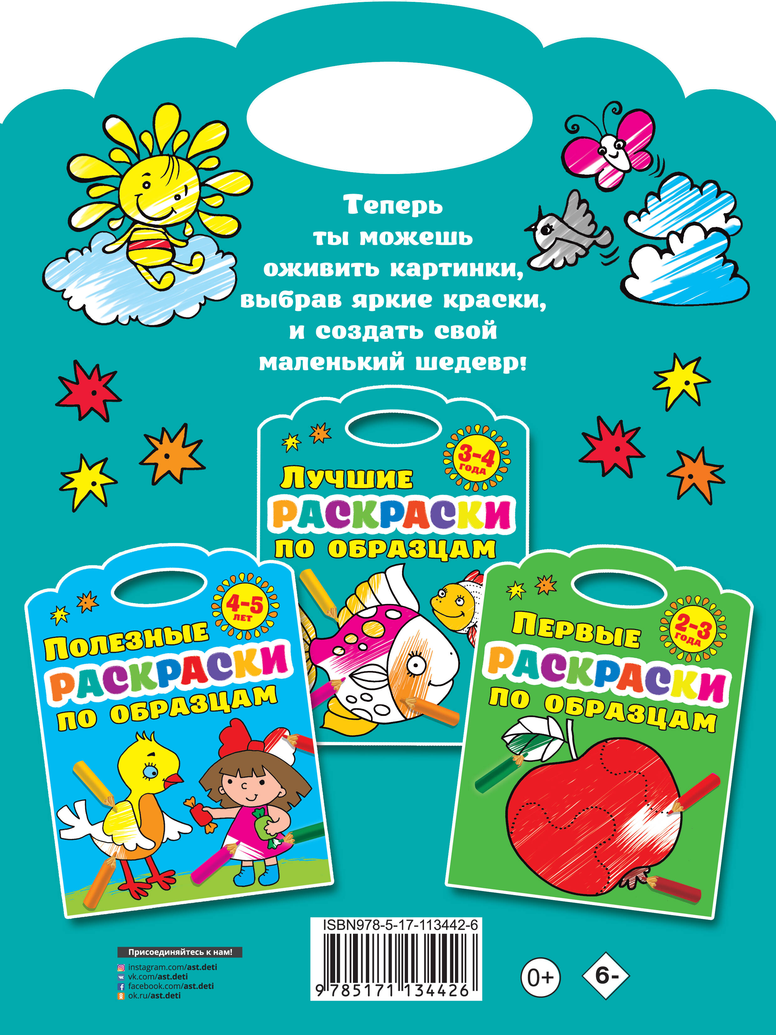 О чем эта книга Серия «Раскраски по образцу» привлечет внимание покупателей необычной фигурной вырубкой и яркой обложкой. «Лучшие раскраски по образцам 3-4 года» - замечательная книжка, которая поможет вам и вашему ребенку интересно и с пользой провести свободное время, а также в игровой форме выучить названия цветов радуги. Кому эта книга будет интересна Занимательная раскраска - коллекция картинок с цветными образцами для развития мелкой моторики и знакомства с цветами радуги. Каковы особенности этой книги • На каждом развороте - забавный рисунок и образец, на который нужно ориентироваться при раскрашивании картинки. • Чёткий контур, крупные картинки, красочные цветные образцы. • Простота подаваемого материала позволят детям без труда запомнить названия цветов радуги. • Раскрашивать забавные картинки на плотной белой бумаге можно цветными карандашами, фломастерами, мелками, красками. • Занятия с книжкой помогут ребенку тренировать пальчики, развивать речь, внимание, мышление, фантазию. Раскрашиваем и по цветным образцам. Учимся - играя!| Издательство | Издательство "АСТ" |