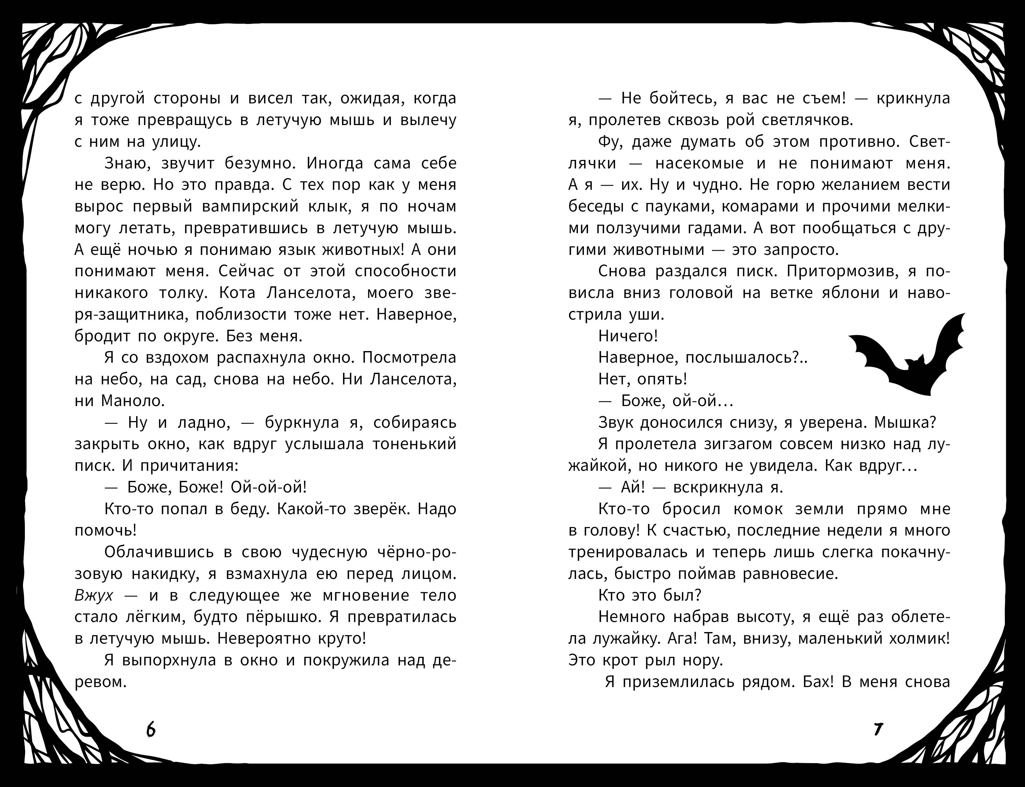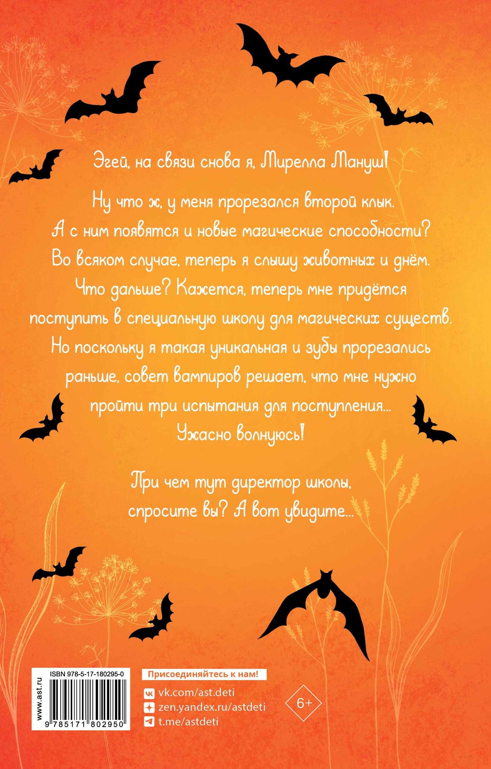 Эгей, на связи снова я, Мирелла Мануш! Ну что ж, у меня прорезался второй клык. А с ним появятся и новые магические способности? Во всяком случае, теперь я слышу животных и днём. Что дальше? Кажется, теперь мне придётся поступить в специальную школу для магических существ. Но поскольку я такая уникальная и зубы прорезались раньше, совет вампиров решает, что мне нужно пройти три испытания для поступления… Ужасно волнуюсь! При чём тут директор школы, спросите вы? А вот увидите…