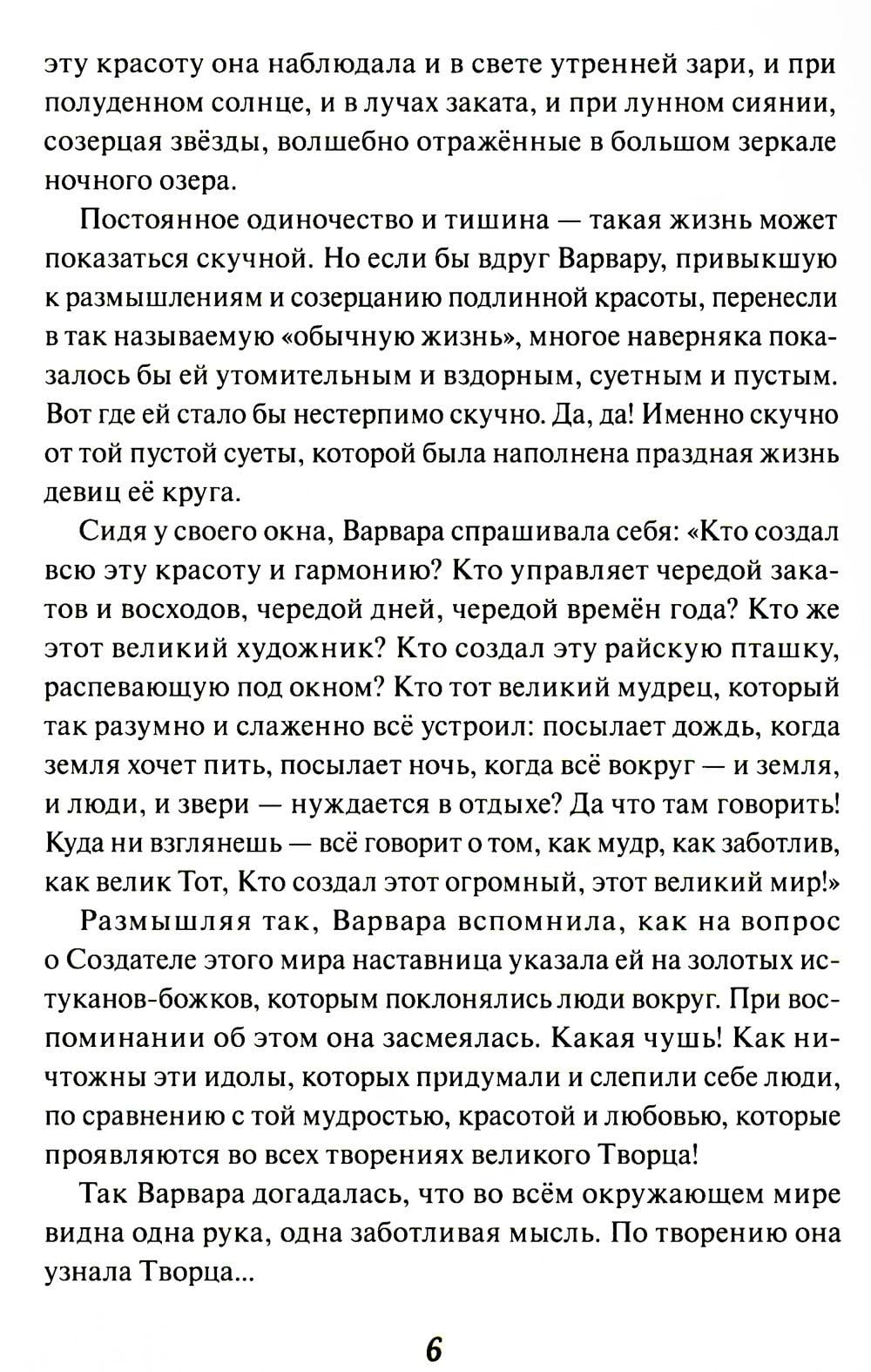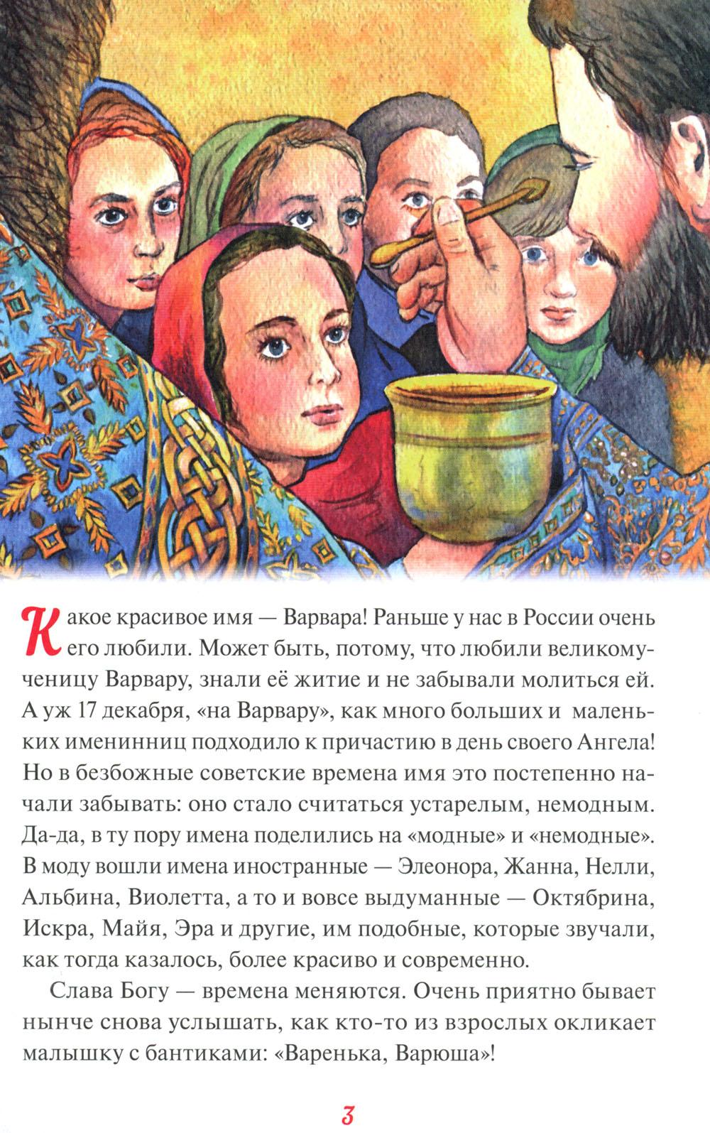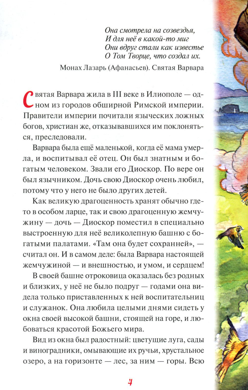 Город Илиополь, где жила святая Варвара, был крупнейшим центром поклонения языческим богам. Развалины его находятся сейчас на территории Ливана в шестидесяти пяти километрах к северо-востоку от Бейрута. Древнее название Илиополя - Баальбек связано с именем идола Ваала. Конечно, исповедовать Христа в этом языческом городе было опасно. Но святая Варвара, совсем молодая девушка, воспитанная практически в тепличных условиях, не устрашилась ни мучений, ни смерти. О том, как Варвара уверовала во Христа, как полюбила Его от всего сердца, как мужественно пострадала за свою веру, маленькие читатели узнают из этой книжки. Лучше понять и запомнить рассказ помогут красивые иллюстрации.| Издательство | Духовное преображение |
