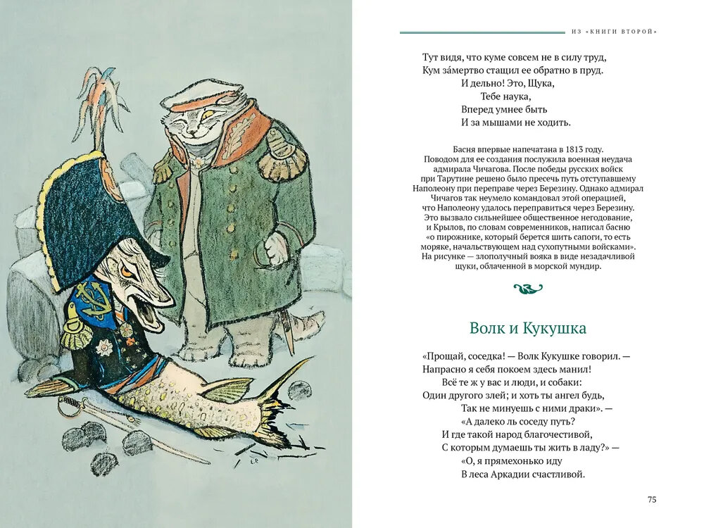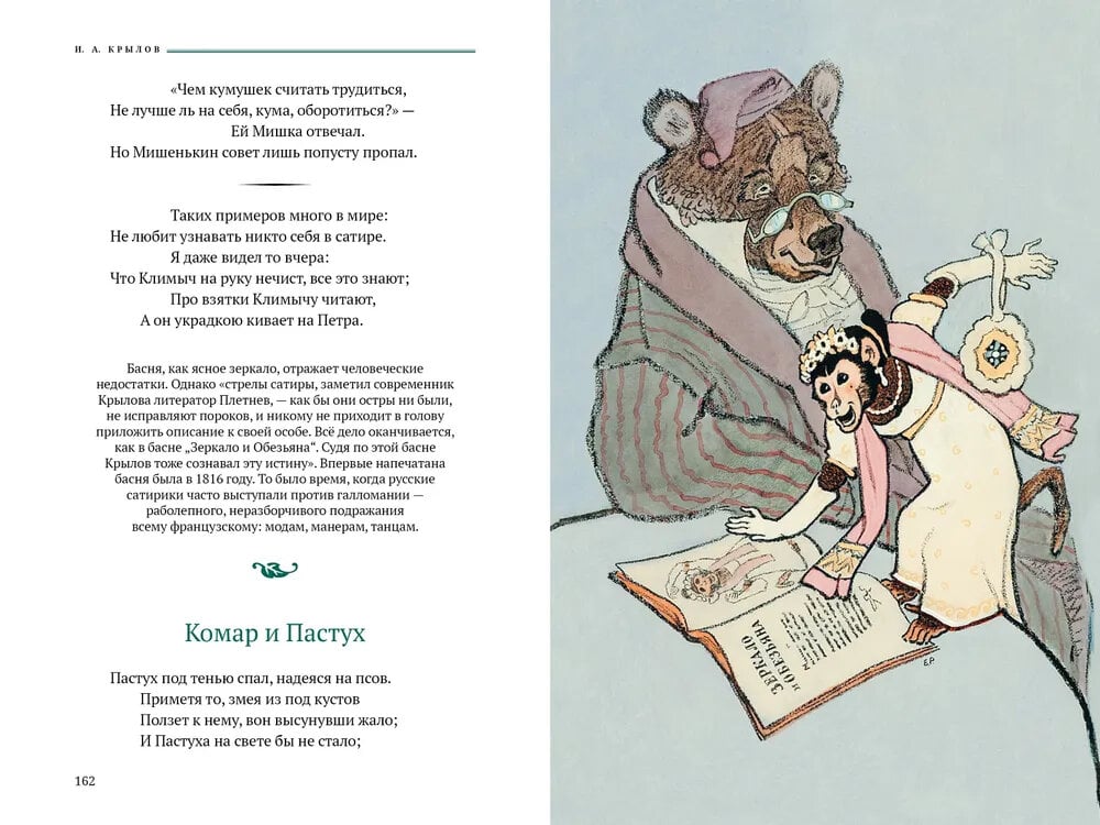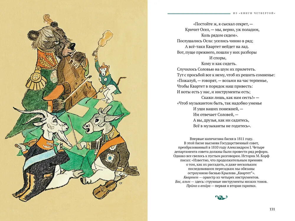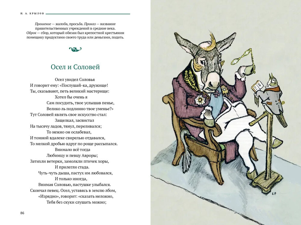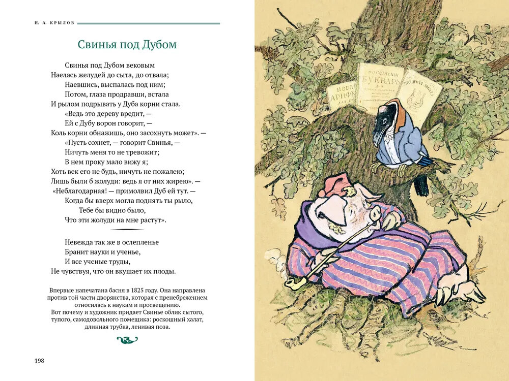 Басни И. А. Крылова (1769-1844) были встречены современниками писателя с огромным интересом. Читающая публика смеялась над аллегорическими картинами, запоминала остроумные суждения баснописца. Издания его книг становились главными событиями литературной жизни России. При жизни его называли великим и народным. Но и поныне нас удивляют это мудрое понимание жизни и поразительное мастерство поэтического образа, меткость слова и колорит языка Крылова. Рисунки к классическим басням созданы Евгением Михайловичем Рачёвым (1906-1997). Они сразу вошли в золотой фонд книжной иллюстрации. Е. М. Рачёв подмечает в героях-животных детали человеческой мимики, показывает их нрав и характер. Персонажи басен Крылова буквально оживают в ярчайших иллюстрациях художника.| Издательство | Аркадия |