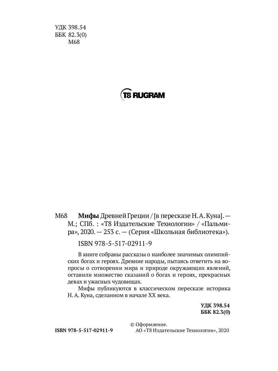 В книге собраны рассказы о наиболее значимых олимпийских богах и героях. Древние народы, пытаясь ответить на вопросы о сотворении мира и природе окружающих явлений, оставили множество сказаний о богах и героях, прекрасных девах и ужасных чудовищах. Мифы публикуются в классическом пересказе историка Н. А. Куна, сделанном в начале XX века.| Издательство | Т8 RUGRAM |