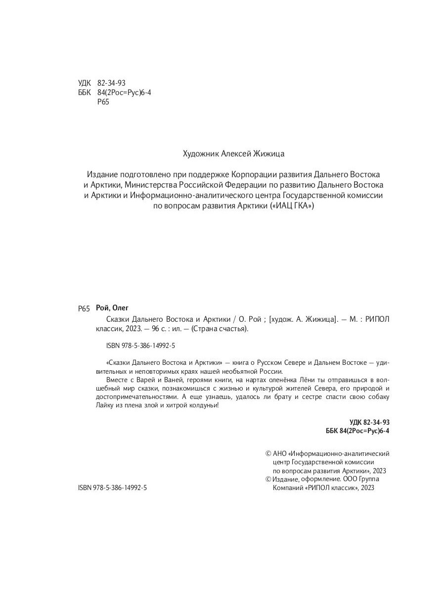 «Сказки Дальнего Востока и Арктики» - книга об удивительных приключениях героев полюбившейся многим «Азбуки Арктики и Дальнего Востока». Очаровательная и любознательная девочка Варя, её младший брат Ваня, их весёлая собачка Лайка и оленёнок Лёня отправятся в сказочное путешествие. Им предстоит сразиться со страшной и злой ведьмой Катгыргын, найти новых друзей, погрузиться в древние истории и легенды Дальнего Востока и Арктики. Чудесные иллюстрации художника Алексея Жижицы. Отправляйтесь в сказочное путешествие!| Издательство | Рипол Классик |