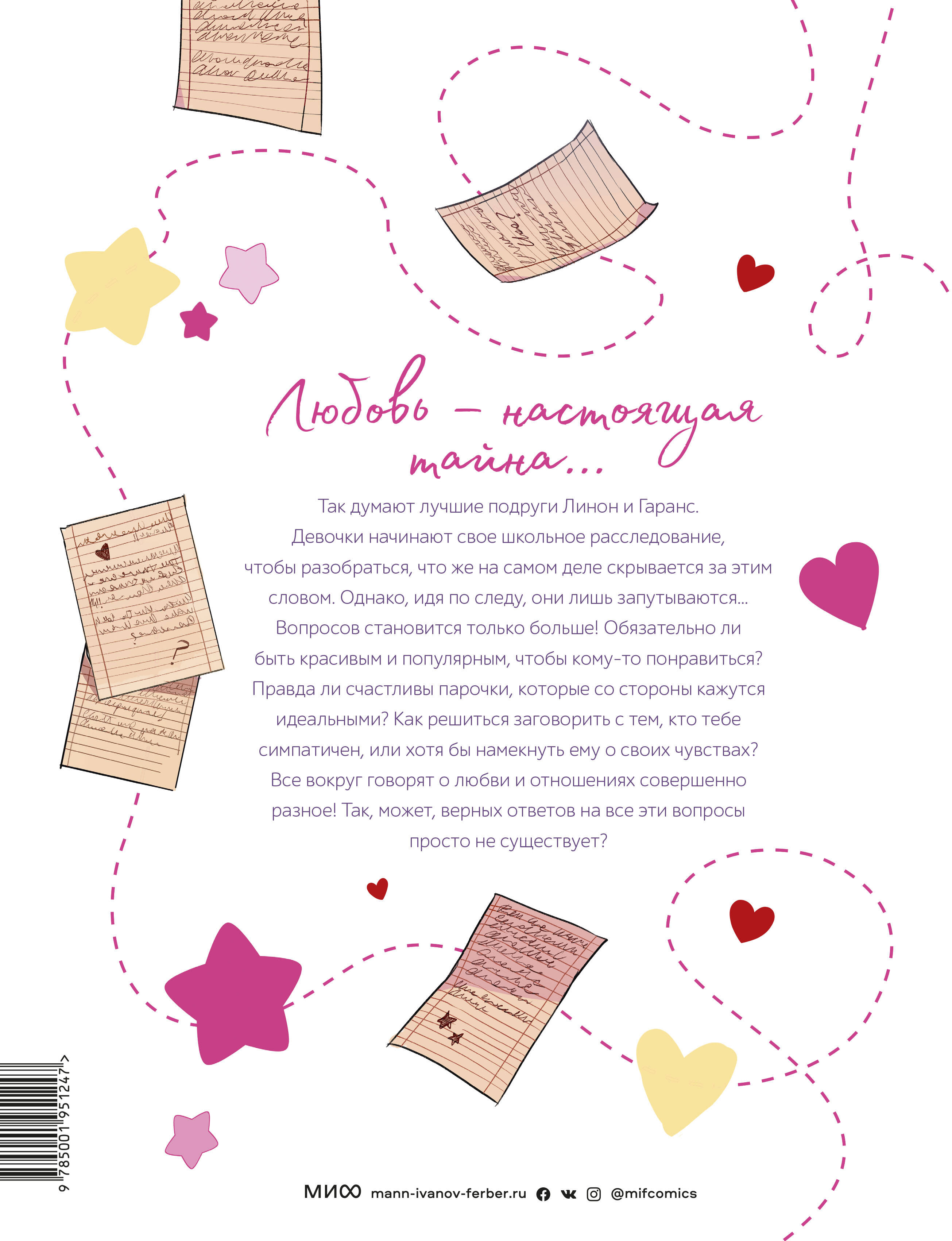 Одиннадцатилетние подруги Линон и Гаранс много думают о любви и ее тайнах. Линон влюблена в Ноа, но не понимает, почему он избегает ее, ведь они так давно знакомы. А Гаранс совсем не верит в любовь и убеждена, что все отношения рано или поздно заканчиваются. Разные взгляды подталкивают девочек начать настоящее школьное расследование, чтобы разобраться, что же на самом деле скрывается под этим словом - любовь. Однако они запутываются, а вопросов становится все больше. Оказывается, вокруг этого чувства столько секретов, что они влияют не только на жизнь в школе, но и на каждую из героинь. Фишки книги - Школьная история о двух девочках, которые пытаются разобраться, что такое любовь. - Поможет понять и принять свои чувства. - Тема и герои актуальны для подростков. - Сюжет с элементами детектива.| Издательство | Манн, Иванов и Фербер |