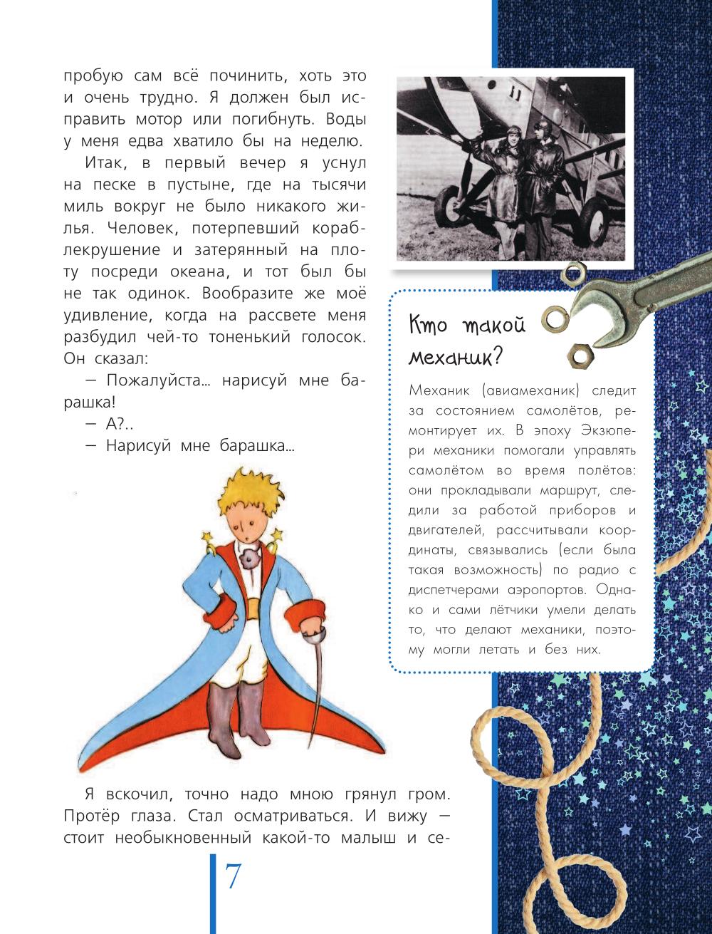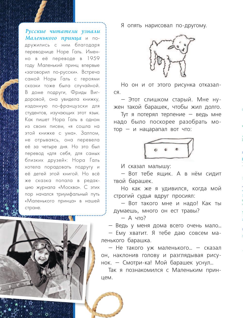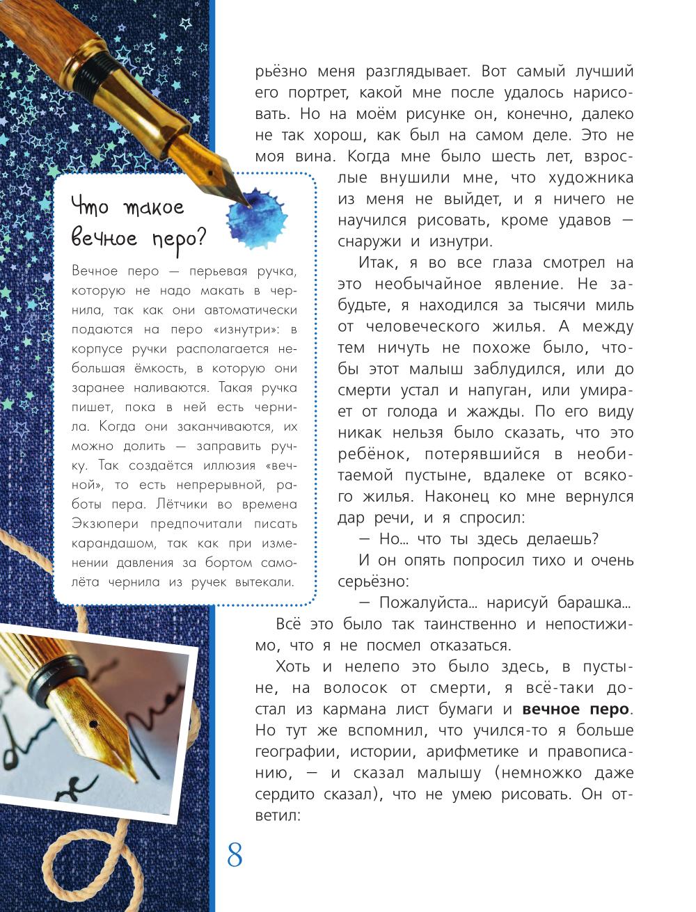 Сказка Антуана де Сент-Экзюпери «Маленький принц» впервые была издана в 1943 году. Через год писатель пропал без вести, совершая разведывательный полет... В России она вышла только в 1959 году в переводе Норы Галь, и с тех пор тысячи детей каждый год открывают ее для себя и задают взрослым самые разные вопросы о Летчике, о Розе, о Лисе, о Маленьком принце... В этом издании, кроме текста сказки и авторских рисунков к ней, есть еще комментарии, благодаря которым читатель сможет узнать смысл незнакомых слов, предметов и понятий, а также приоткрыть философское содержание притчи. Что такое баобаб? И какого размера они бывают? Кто такой честолюбец? И чем он отличается от тщеславного человека? Зачем нужны фонарщики и трубочисты? Есть ли они сегодня? Что такое вечное перо? Не им ли пишутся вечные книги? Почему астроном вынужден был снять турецкую одежду? Зачем монархи носят пурпур и горностай? Почему на рисунках Маленький принц всегда разный?| Издательство | АСТ |