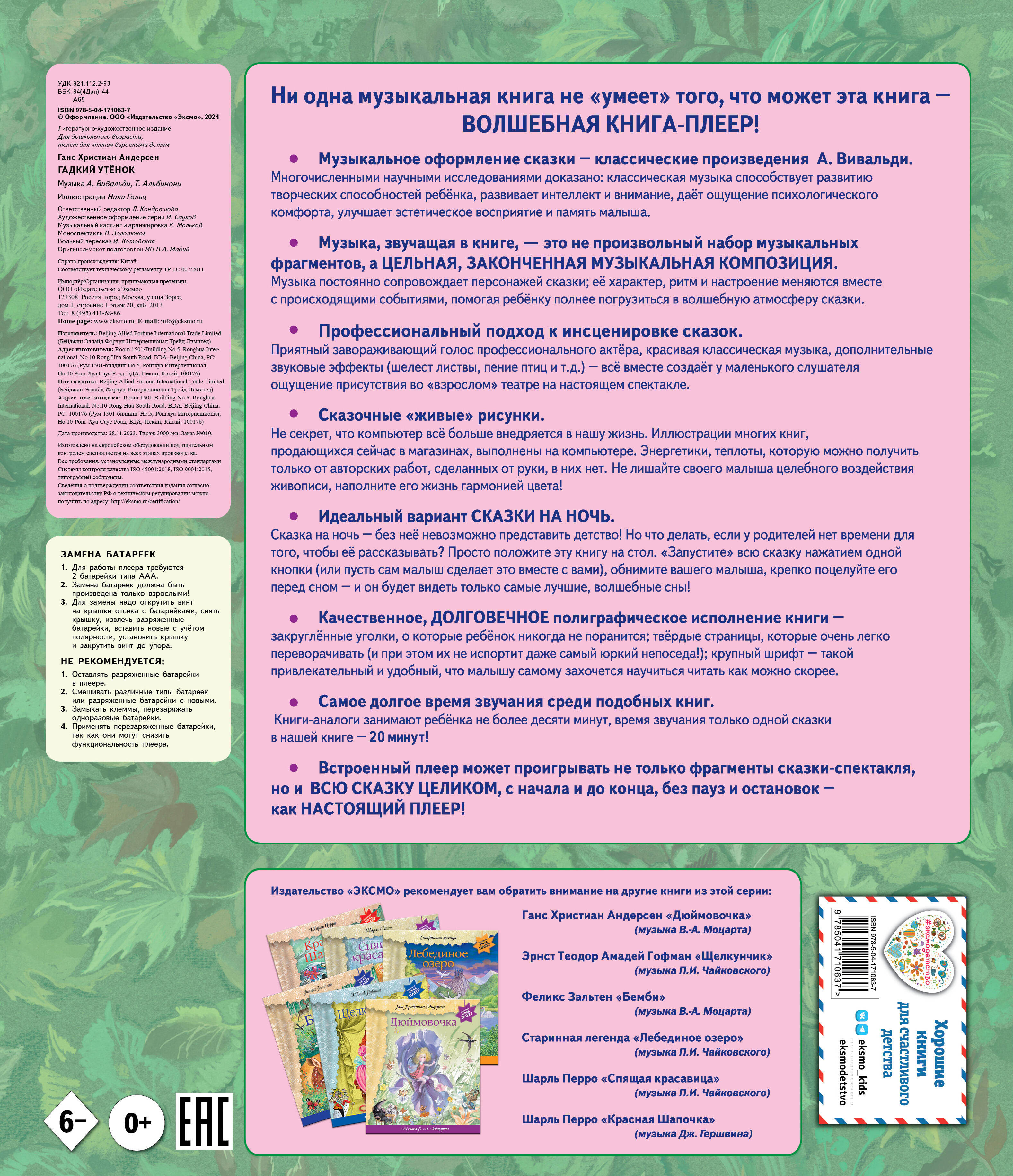 Музыкальная книга-плеер - это прекрасное сочетание традиционной книги и современных технологий. Красочное иллюстрированное издание классической сказки дополнено звуковым модулем-плеером. Яркие, крупные кнопки на панели модуля позволяют прослушать сказку как по главам, так и полностью, от начала до конца, а также сделать паузу в прослушивании. Время звучания всей сказки - 25 минут, РЕКОРД СРЕДИ ЗВУКОВЫХ КНИГ. Наша книга - это идеальный вариант «сказки на ночь»: пока ребёнок слушает книгу и засыпает, взрослые могут заняться своими делами. Профессиональное художественное чтение текста сопровождается завершёнными музыкальными композициями - шедеврами мировой классики. Только в наших книгах-плеерах используются дополнительные звуки (шелест листвы, пение птиц и т. п.), создающие эффект присутствия на настоящем спектакле! Музыкальная книга-плеер укомплектована двумя энергоёмкими алкалиновыми батарейками типа ААА. Музыкальные книги крайне полезны в процессе воспитания и развития детей. Они способствуют развитию мелкой моторики, образного мышления, речи, формируют эстетическое восприятие. Классическая музыка положительно влияет на развитие интеллекта и даёт ощущение психологического комфорта.| Издательство | ООО "Издательство "Эксмо" |