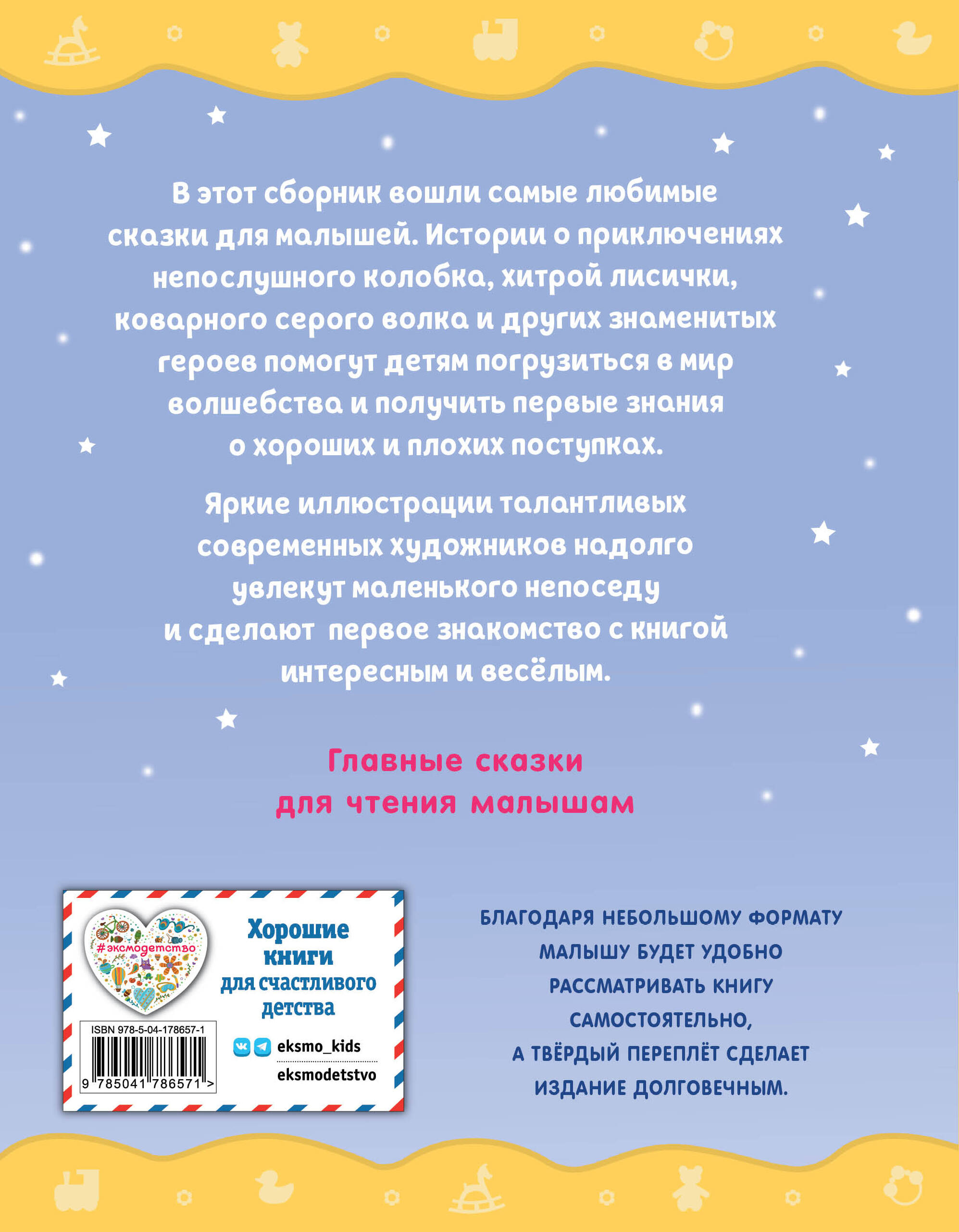 - 9 главных сказок для малышей в одной книге! - Твёрдый переплёт, яркое оформление, красивые цветные иллюстрации. - Лёгкие книги удобного формата, которые малышу удобно рассматривать самостоятельно. - Любимые произведения для чтения с рождения. Эта книга поможет малышам совершить первое путешествие в мир фантазии и волшебства. Дети с удовольствием послушают увлекательные истории, научатся сопереживать, быть добрыми и справедливыми. В сборнике представлены короткие сказки для самых маленьких: «Курочка Ряба», «Колобок», «Красная Шапочка», «Репка» и другие. Милые герои, нарисованные талантливыми современными художниками, станут надёжными друзьями ребёнка, с которыми он долгое время не захочет расставаться.| Издательство | ООО "Издательство "Эксмо" |