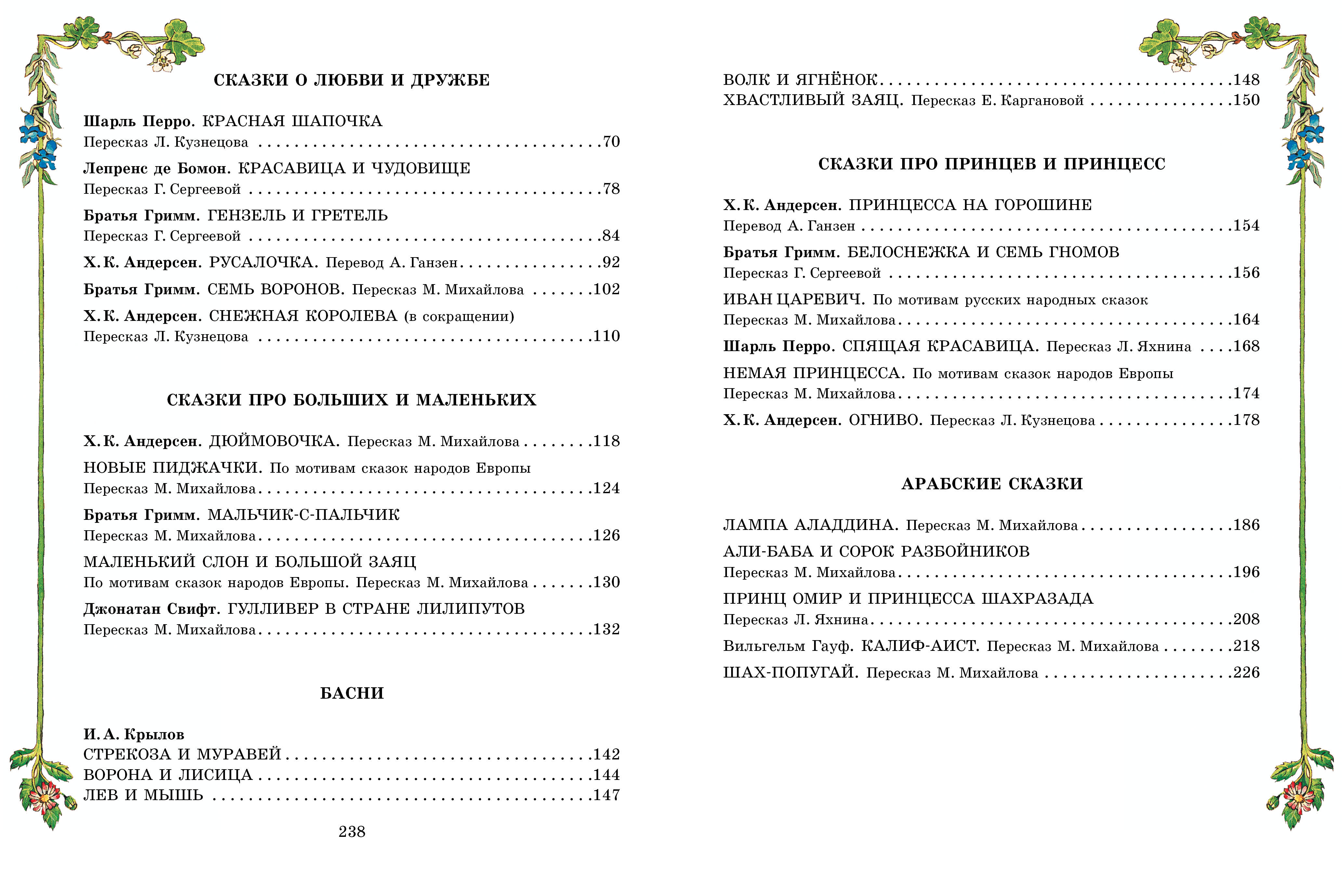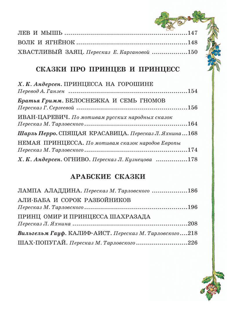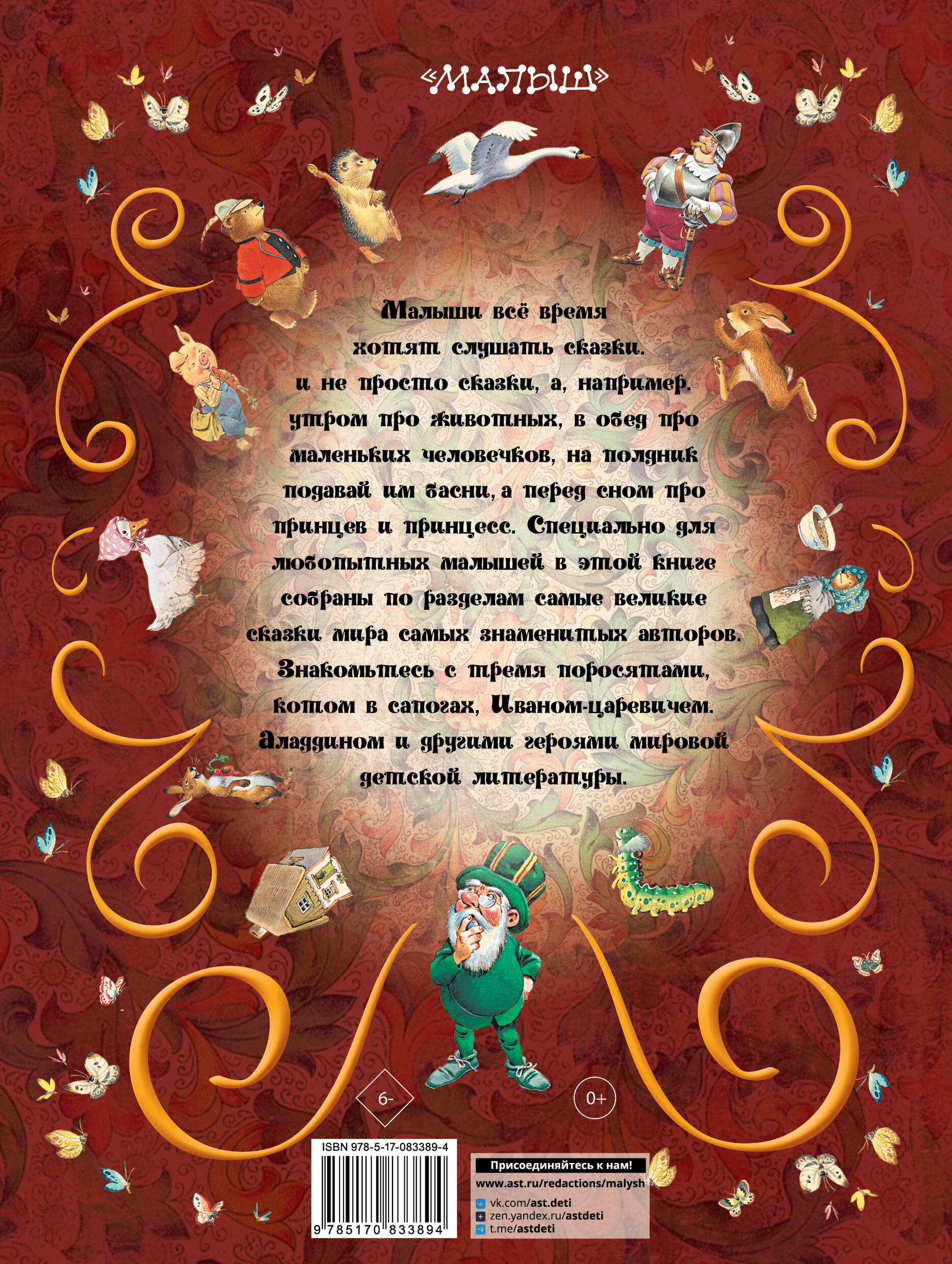 Малыши всё время хотят слушать сказки, и не просто сказки, а, например, утром про животных, в обед про маленьких человечков, на полдник подавай им басни, а перед сном про принцев и принцесс. Специально для любопытных малышей в этой книге собраны по разделам самые великие сказки мира самых знаменитых авторов. Знакомьтесь с тремя поросятами, Котом в сапогах, Иваном-царевичем, Аладдином и другими героями мировой детской литературы.| Издательство | ИЗДАТЕЛЬСТВО "АСТ" |