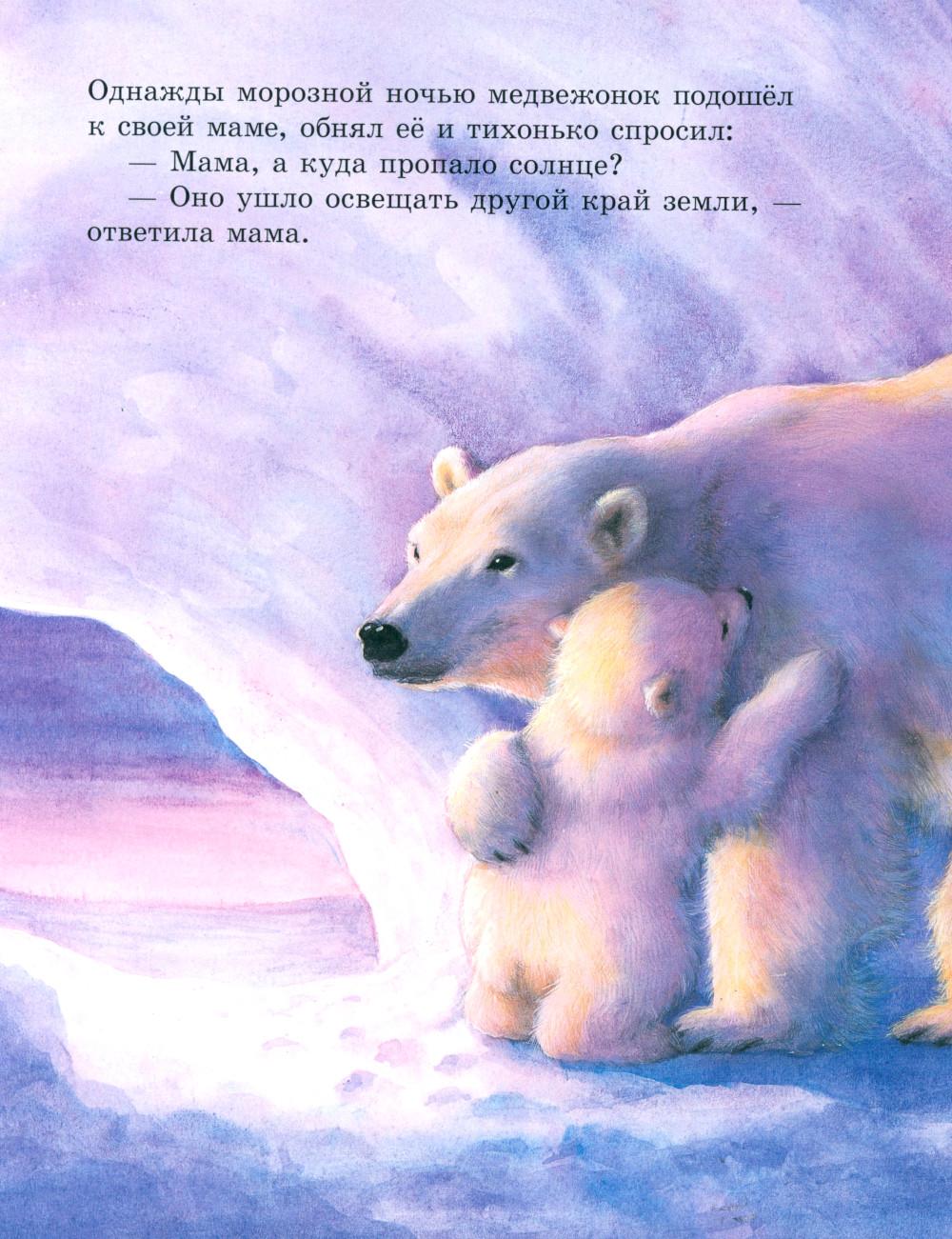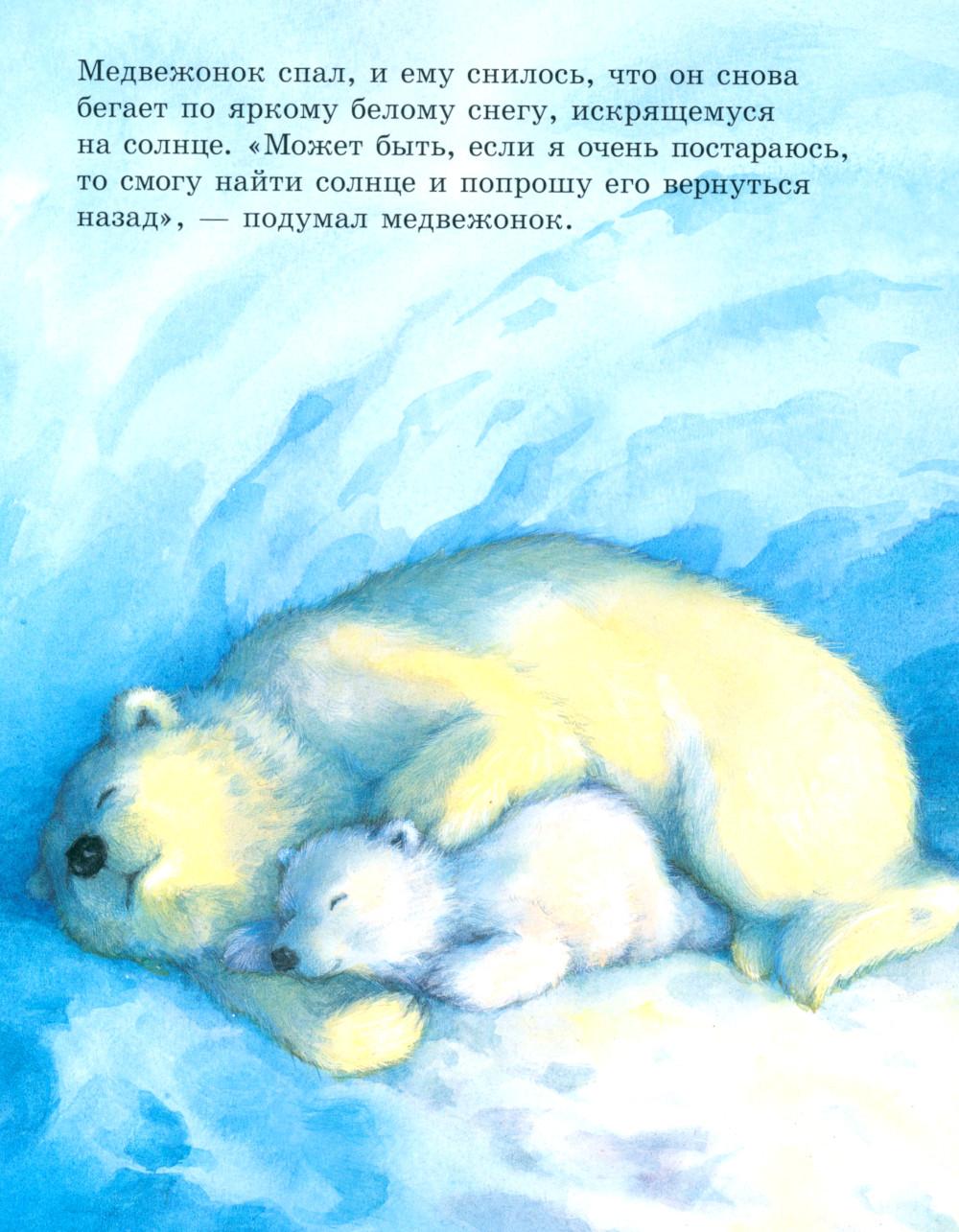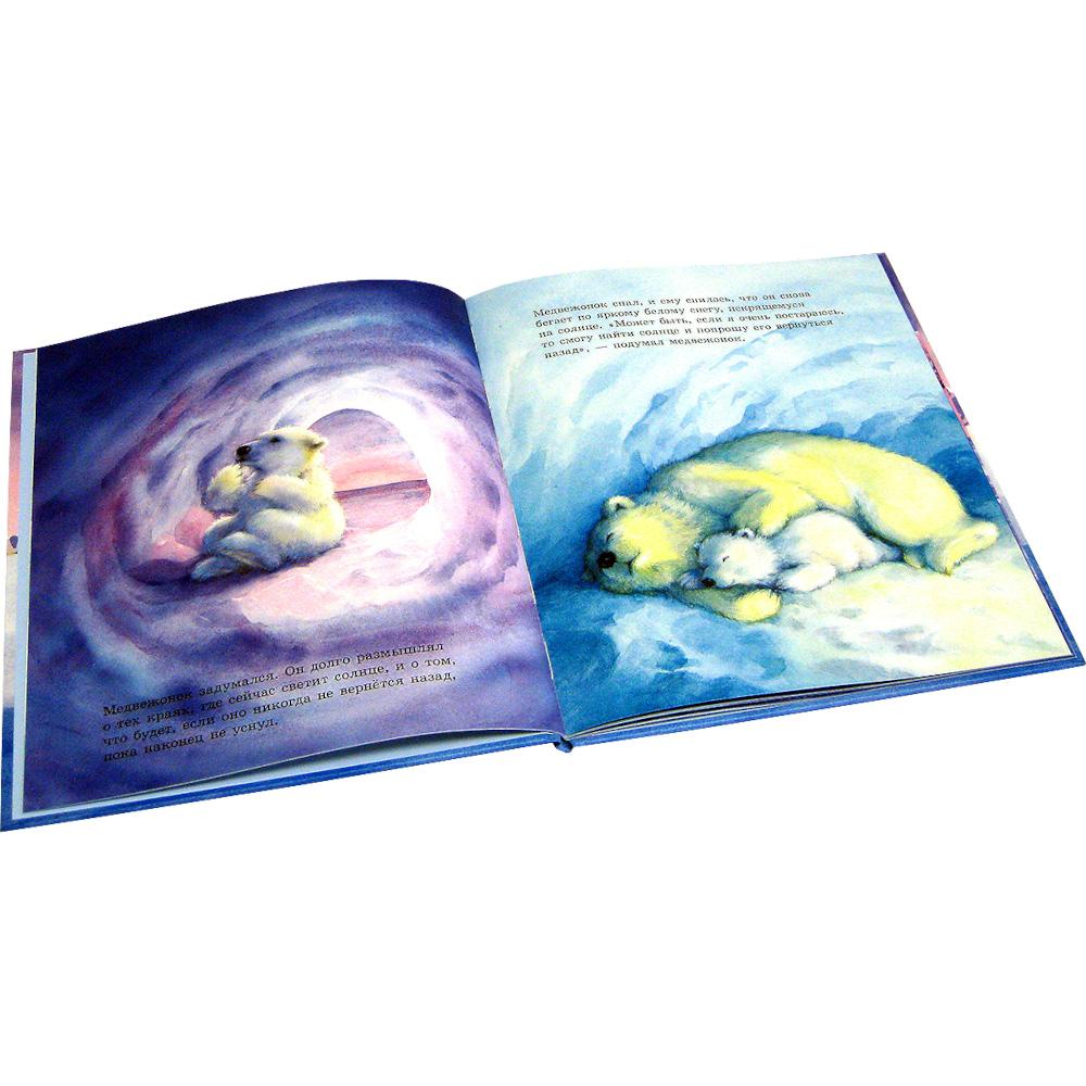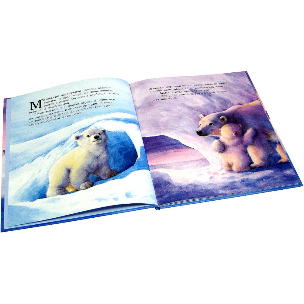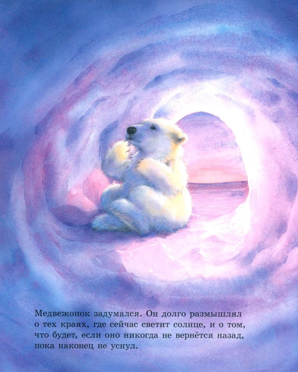 Маленький медвежонок родился в стране вечных снегов и льдов и жил в глубокой тёплой пещере со своей мамой. Летом медвежонок любил играть и резвиться на солнце, но когда в его страну пришла зима, солнце зашло за горизонт и дни стали холодными и тёмными. "А вдруг солнце никогда не вернётся?" - подумал медвежонок и пошёл искать солнце. Впереди его ждут приключения и удивительные открытия; на своём пути он встретит северных оленей, тюленёнка и огромного синего кита, увидит северное сияние и, конечно, найдёт солнце, которое всегда возвращается.| Издательство | Добрая книга |