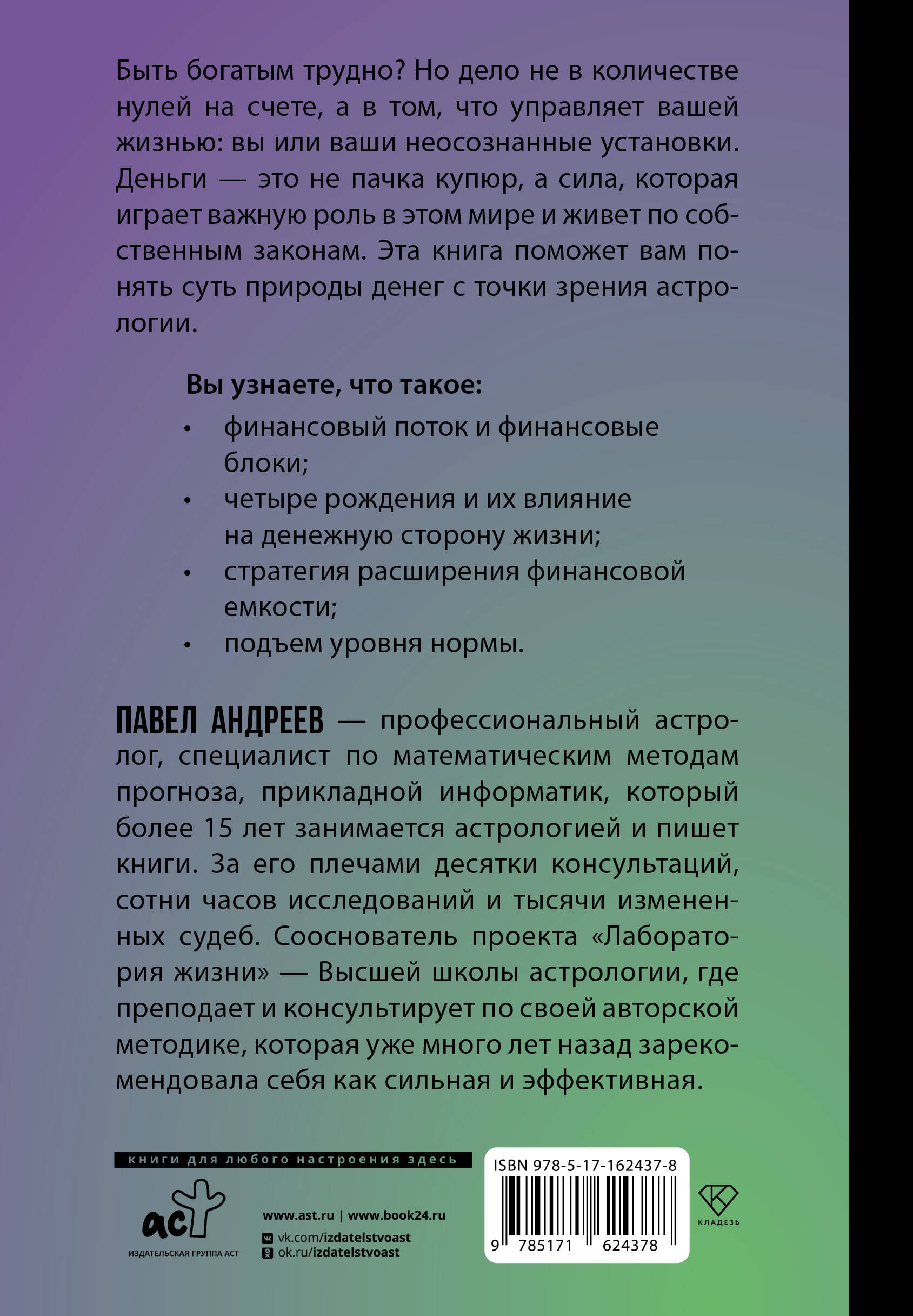 Быть богатым трудно? Но дело не в количестве нулей на счете, а в том, что управляет вашей жизнью: вы или ваши неосознанные установки. Деньги - это не пачка купюр, а сила, которая играет важную роль в этом мире и живет по собственным законам. Эта книга поможет вам понять суть природы денег с точки зрения астрологии. Вы узнаете, что такое: • финансовый поток и финансовые блоки; • четыре рождения и каково их влияние на денежную сторону жизни; • стратегия расширения финансовой емкости; • подъем уровня нормы. Павел Андреев - профессиональный астролог, специалист по математическим методам прогноза, прикладной информатик, который более 15 лет занимается астрологией и пишет книги. За его плечами десятки консультаций, сотни часов исследований и тысячи измененных судеб. Сооснователь проекта "Лаборатория жизни" - Высшей школы астрологии, где преподает и консультирует по своей авторской методике, которая уже много лет назад зарекомендовала себя как сильная и эффективная.| Издательство | Издательство "АСТ" |