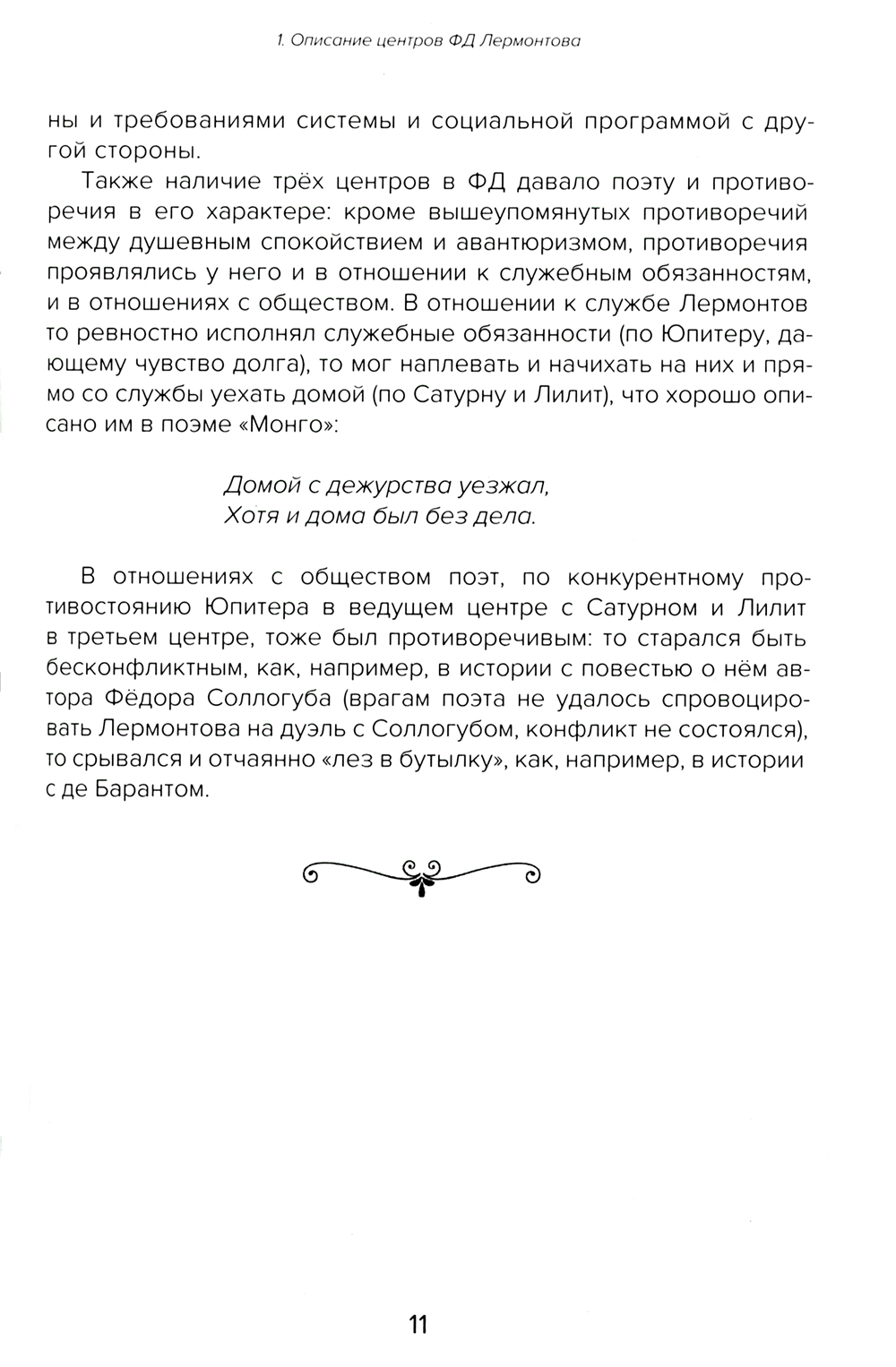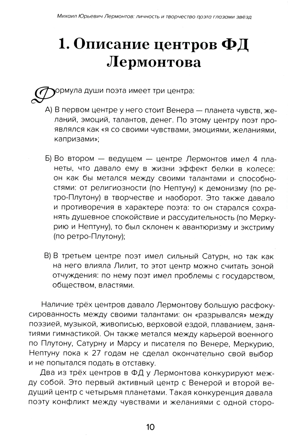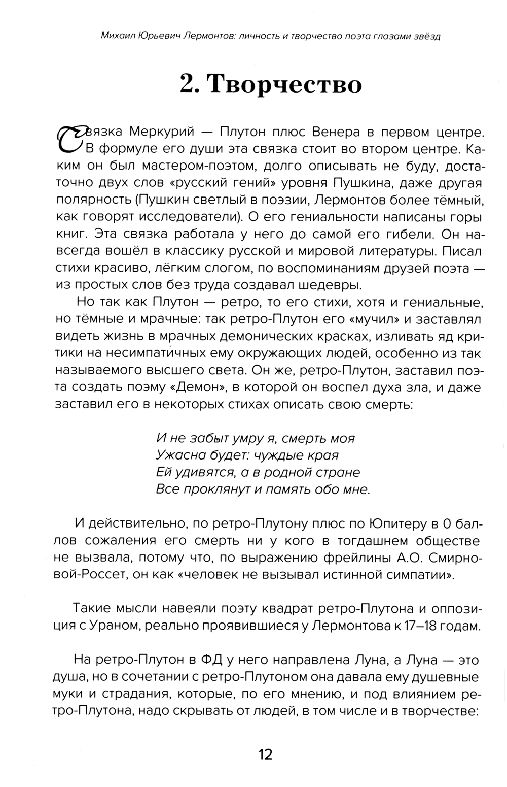 Это совершенно новый взгляд на творчество поэта с точки зрения астрологии. Книга показывает его личность и творчество неоднозначно, но кто из людей однозначен? Ведь гениальность произведений Лермонтова от этого никак не страдает, а показать его живым человеком гораздо интереснее, чем сделать из него гламурно-красивую икону, как принято в нашем литературоведении. Издание предназначено для всех тех, кто интересуется жизнью и творчеством М.Ю. Лермонтова.