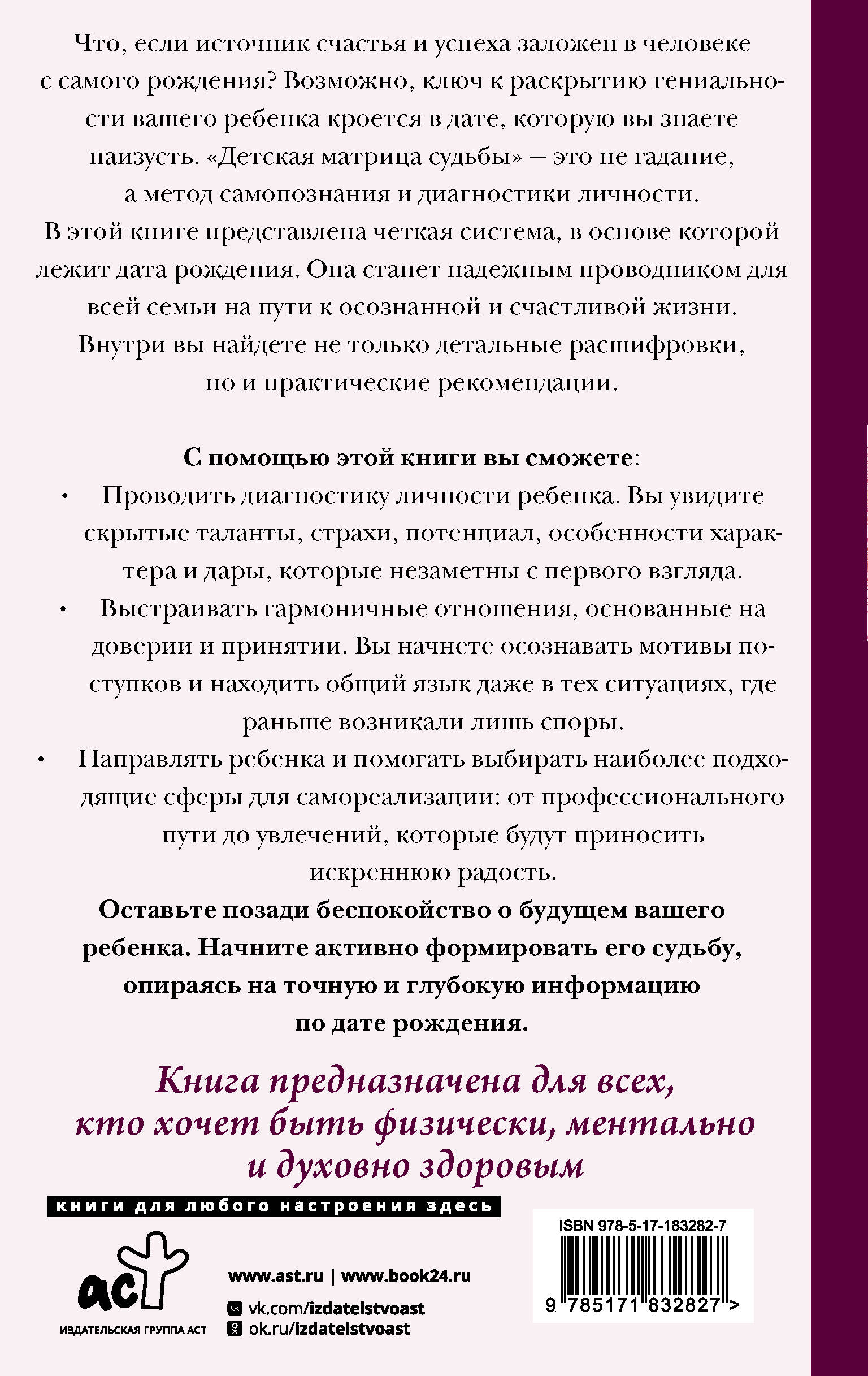 Альбина Матрикс - дипломированный психолог-нумеролог. Эксперт системы самопознания "Матрица судьбы". Что, если источник счастья и успеха заложен в человеке с самого рождения? Возможно, ключ к раскрытию гениальности вашего ребенка кроется в дате, которую вы знаете наизусть. "Детская матрица судьбы" - это не гадание, а метод самопознания и диагностики личности. В этой книге представлена четкая система, в основе которой лежит дата рождения. Она станет надежным проводником для всей семьи на пути к осознанной и счастливой жизни. Внутри вы найдете не только детальные расшифровки, но и практические рекомендации. С помощью этой книги вы сможете: • Проводить диагностику личности ребенка. Вы увидите скрытые таланты, страхи, потенциал, особенности характера и дары, которые незаметны с первого взгляда. • Выстраивать гармоничные отношения, основанные на доверии и принятии. Вы начнете осознавать мотивы поступков и находить общий язык даже в тех ситуациях, где раньше возникали лишь споры. • Направлять ребенка и помогать выбирать наиболее подходящие сферы для самореализации: от профессионального пути до увлечений, которые будут приносить искреннюю радость. Оставьте позади беспокойство о будущем вашего ребенка. Начните активно формировать его судьбу, опираясь на точную и глубокую информацию по дате рождения.| Издательство | Издательство "АСТ" |