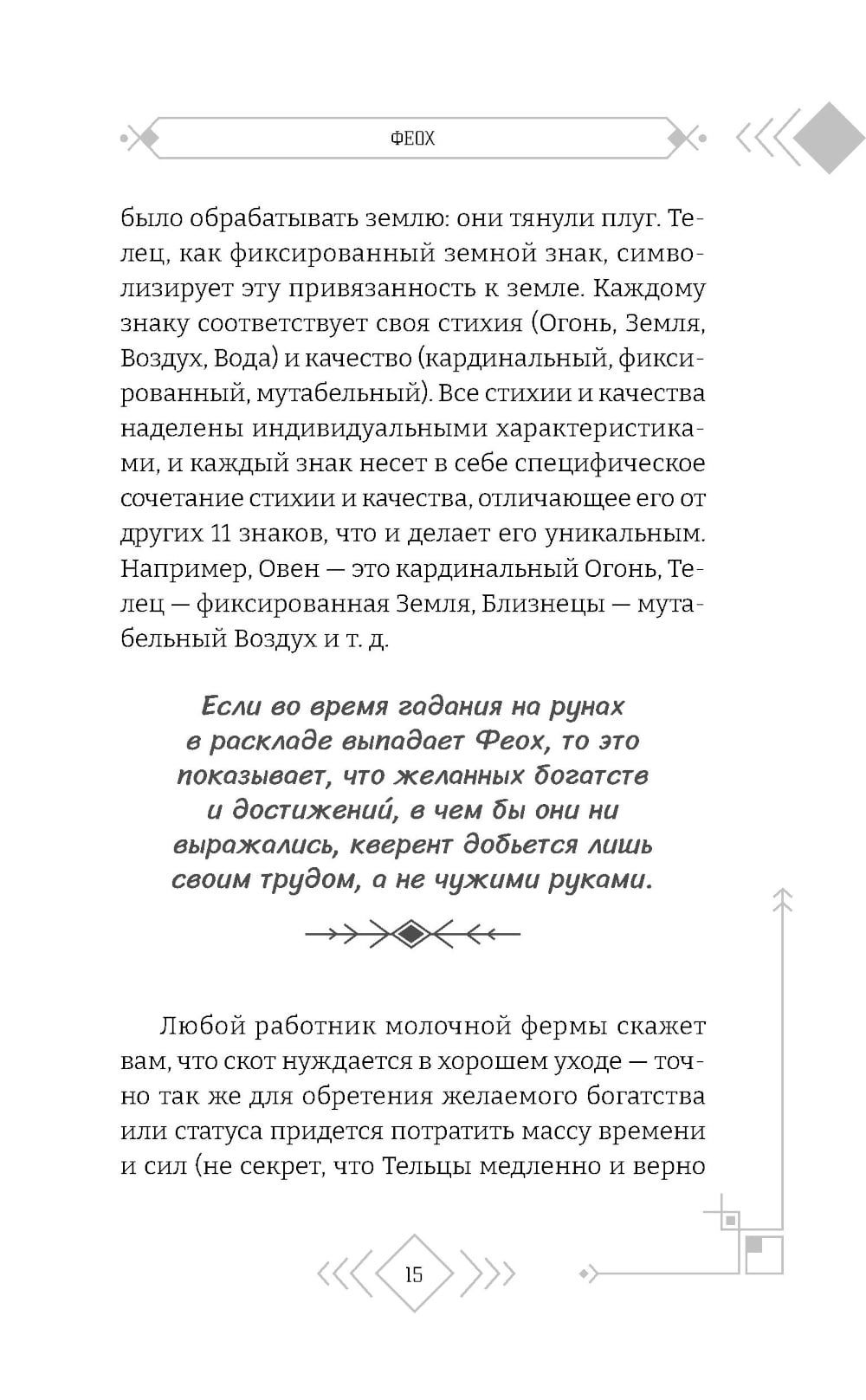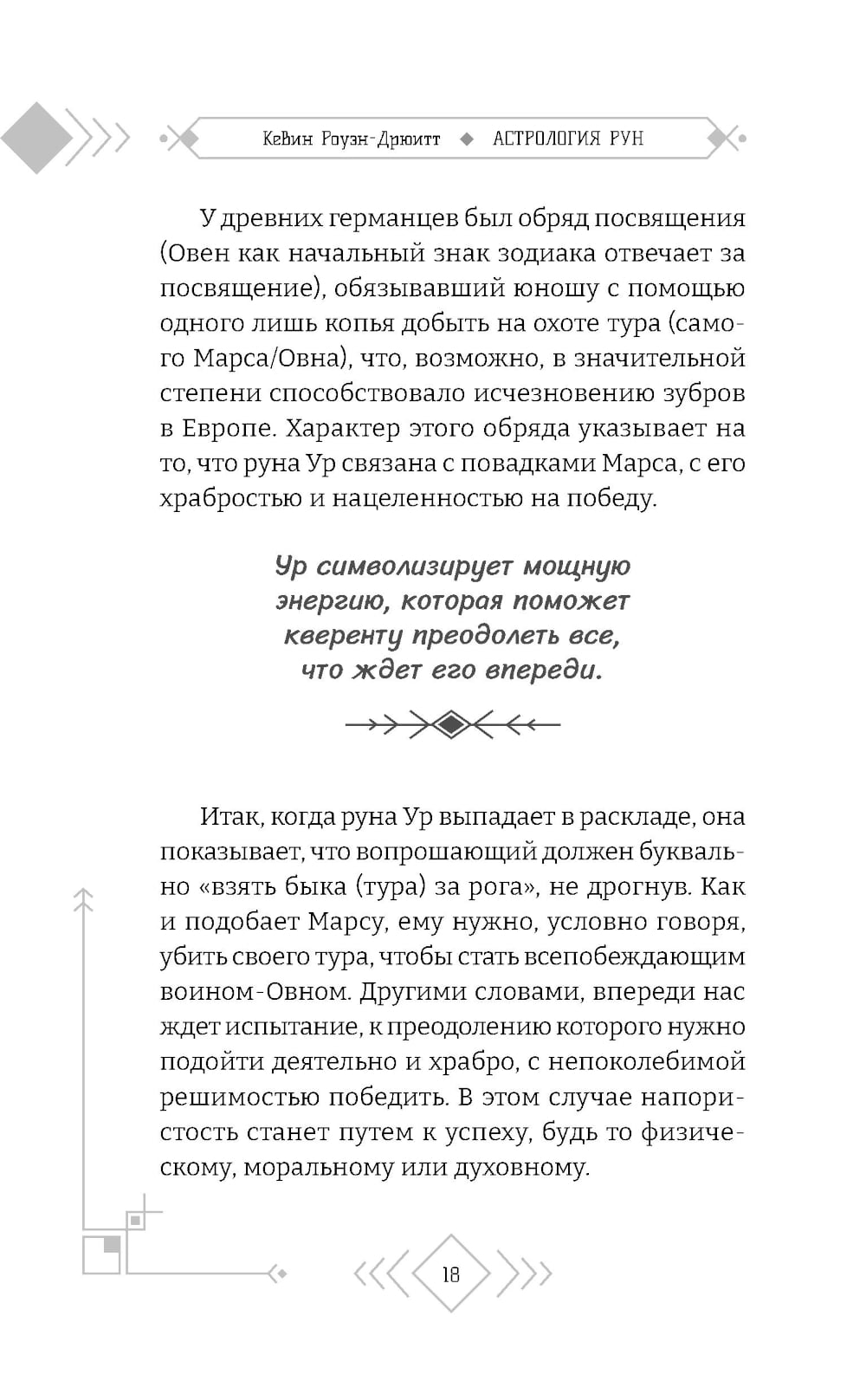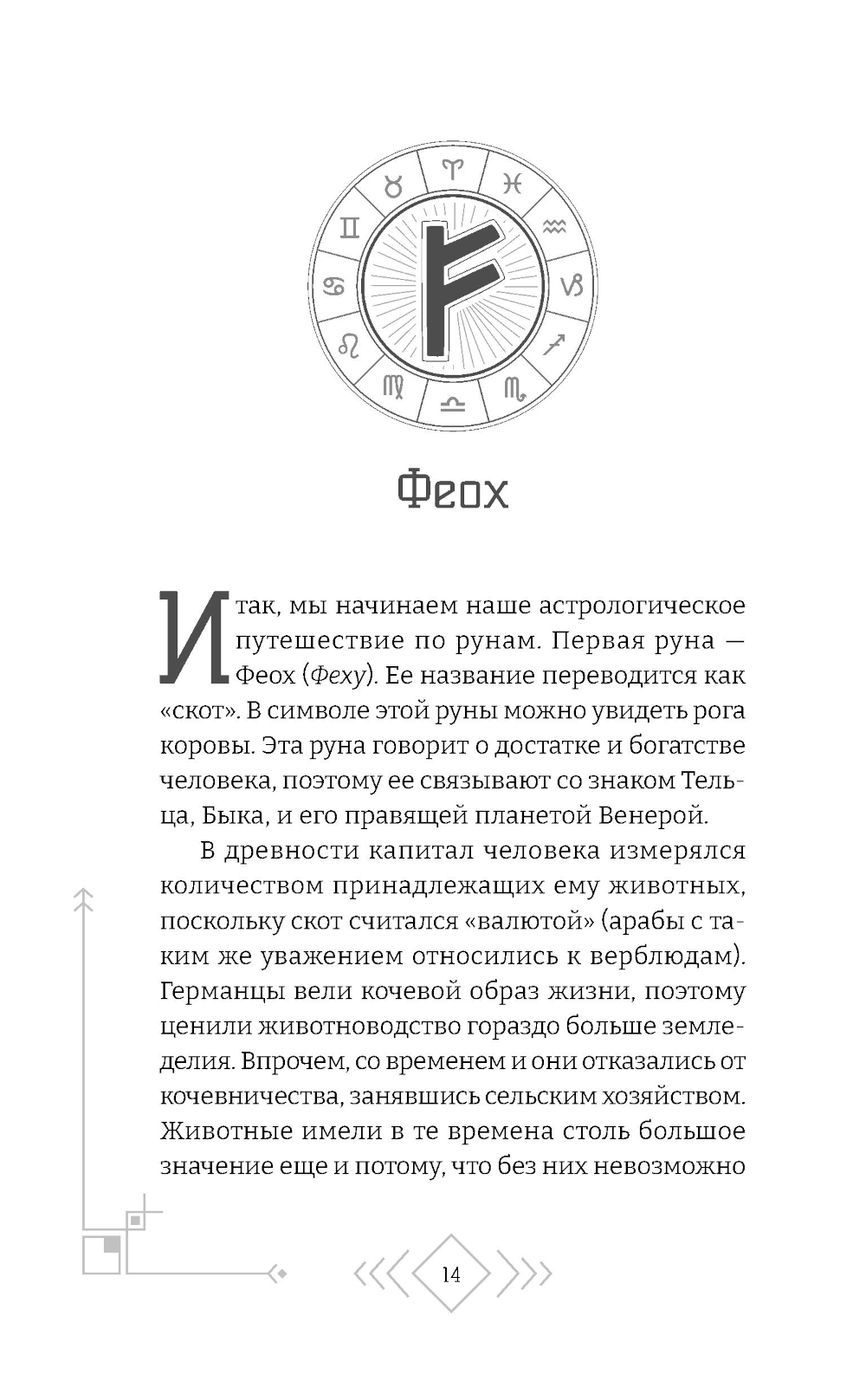Независимо от того, только постигаете вы азы мастерства гадания на рунах древних скандинавов или уже приобрели большой опыт в данном деле, вы в любом случае получите массу удовольствия и знаний при изучении этой книги. Во-первых, в ней изложено все необходимое, чтобы вы могли начать читать руны и получать от них четкие ответы на конкретные вопросы, свои и чужие. Во-вторых, эта книга расширит ваш опыт работы с рунами, представив их в контексте западной астрологии, благодаря чему вам откроется еще более глубокое понимание их посланий. Я подробно освещаю 24 руны так называемого Старшего Футарка, а также 25-ю руну Вирд, добавленную к ним совсем недавно. А еще в конце моей книги я изложил краткую историю рун и сведения о том, как со Старшим Футарком работают в наши дни, чтобы вы могли немедленно приступить к применению своих знаний о рунике.
