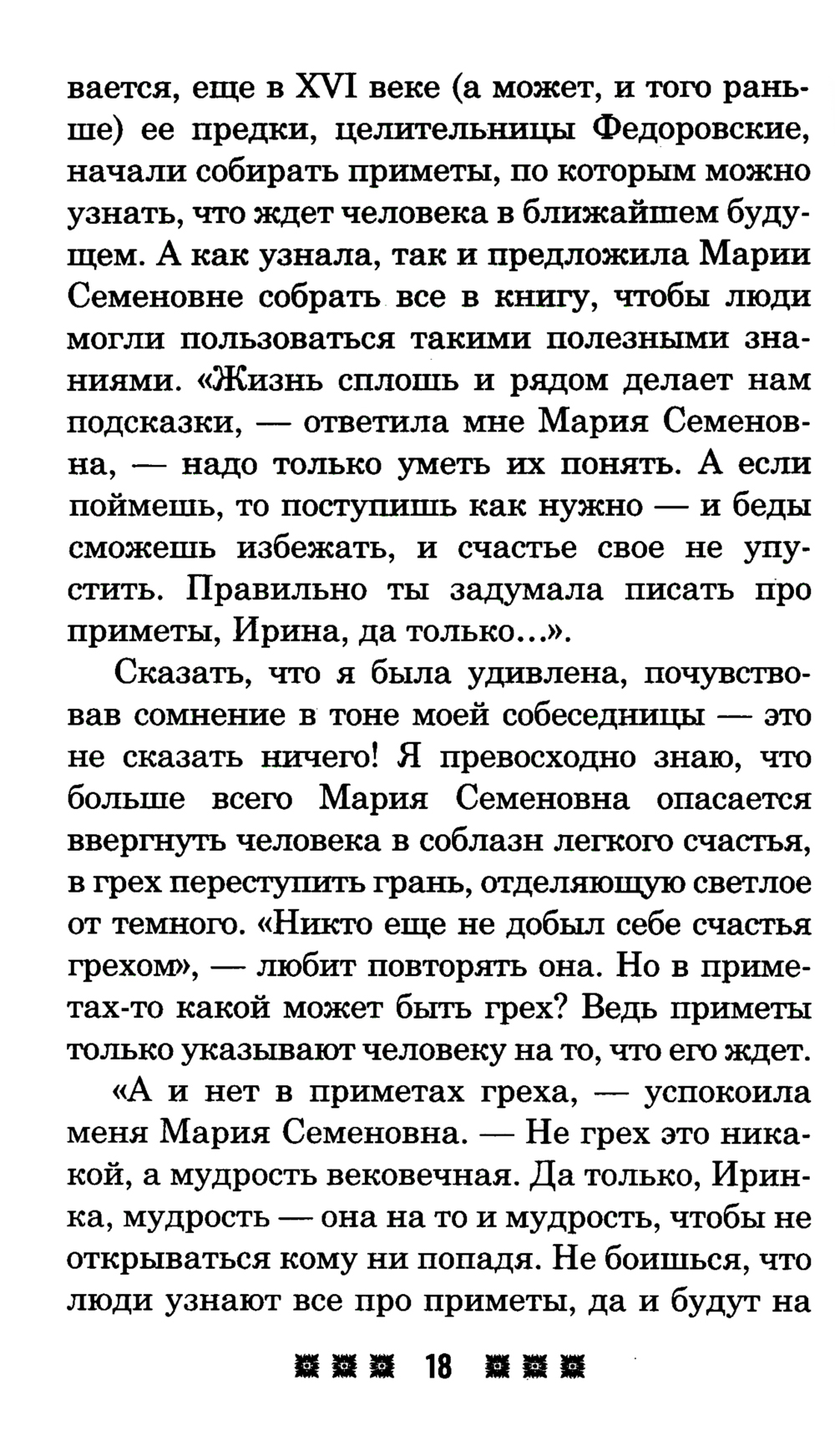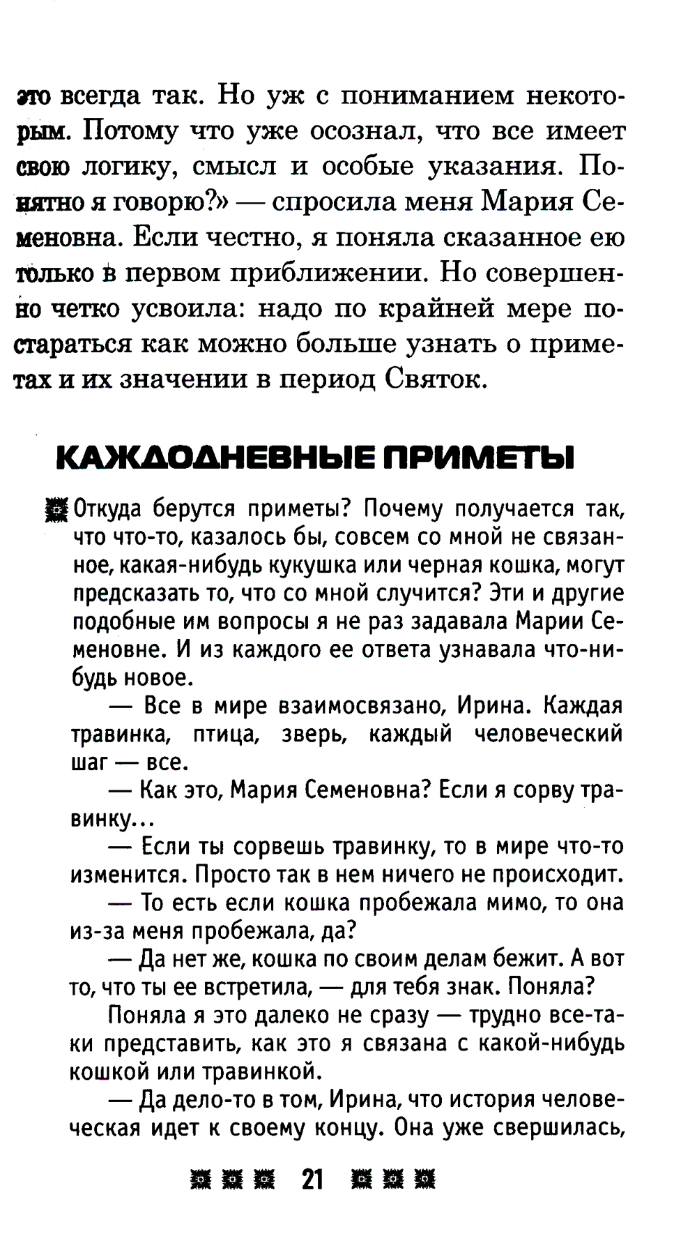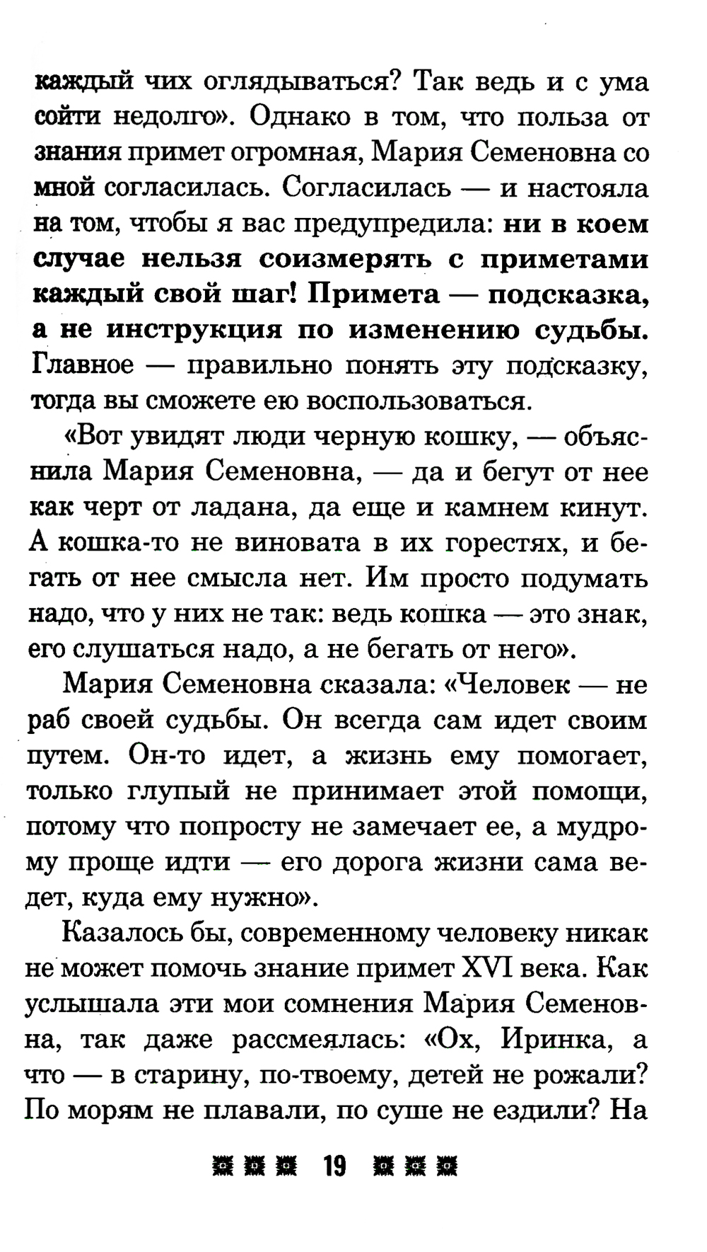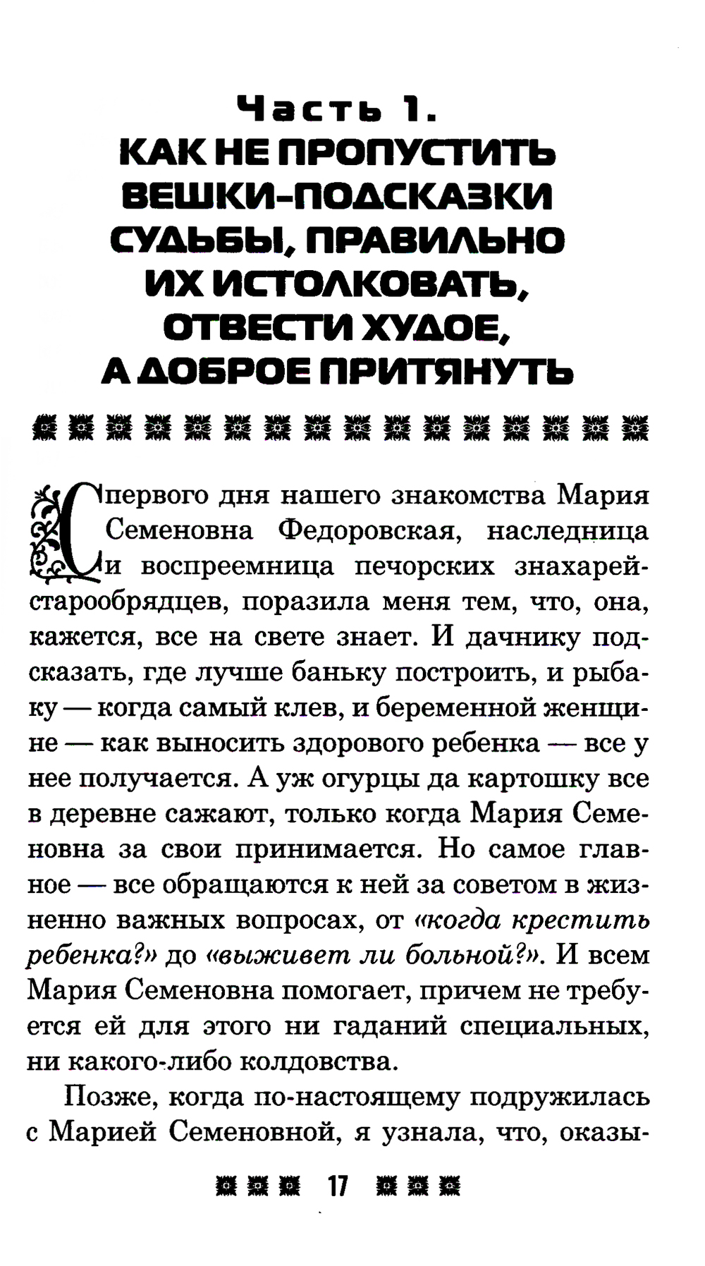 Книга рассказывает о разных способах гаданий и распознавания примет. В первую очередь гадаем на Святки! Потомственная печорская целительница Мария Семеновна Федоровская рассказывает о самом сокровенном, эти уникальные ритуалы ее предки сохраняли три столетия. Даны четкие работающие технологии, которые еще никого не подводили. Хочешь управлять своей судьбой, жить в соответствии со своими чаяниями? Научись читать знаки и подсказки, рассыпанные повсюду; задавать вопросы и делать правильные выводы из ответов на них. Пока человек жив, он все время в ситуации выбора. Выбирай себе такую долю, какую ты хочешь; обходи препоны и преграды; избегай тупиков и обрывов. Печорская целительница Мария Семеновна Федоровская учит, рекомендует, объясняет.| Издательство | Омега-Л |