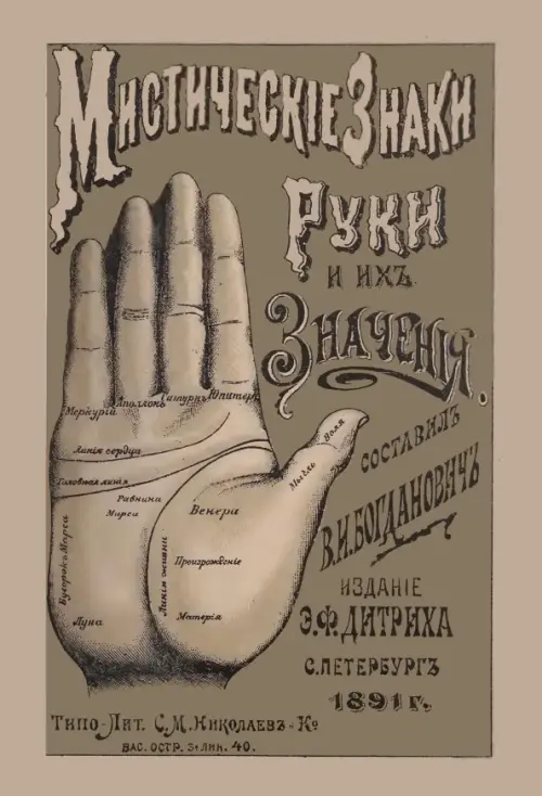Репринт с издания. СПб. , 1891. Книга по хиромантии. В ней сообщаются сведения лишь о тех важнейших знаках, по которым определяется время и, почти всегда, род прошедших болезней, угадываются за много лет вперед предыдущие болезни, а так же определяются различные склонности, способности и темпераменты. Тираж 30 экз. выполнен по технологии print-on-demand. Составитель Богданович В. И.