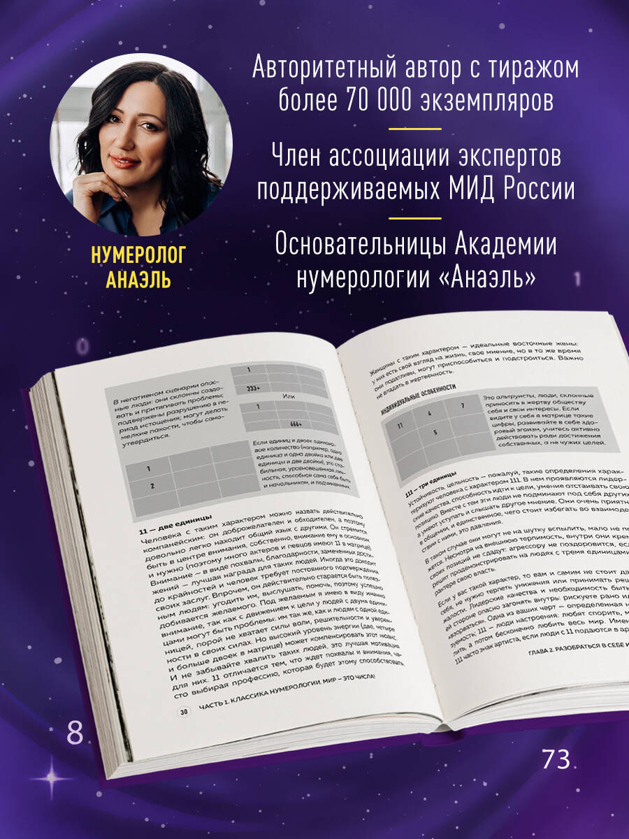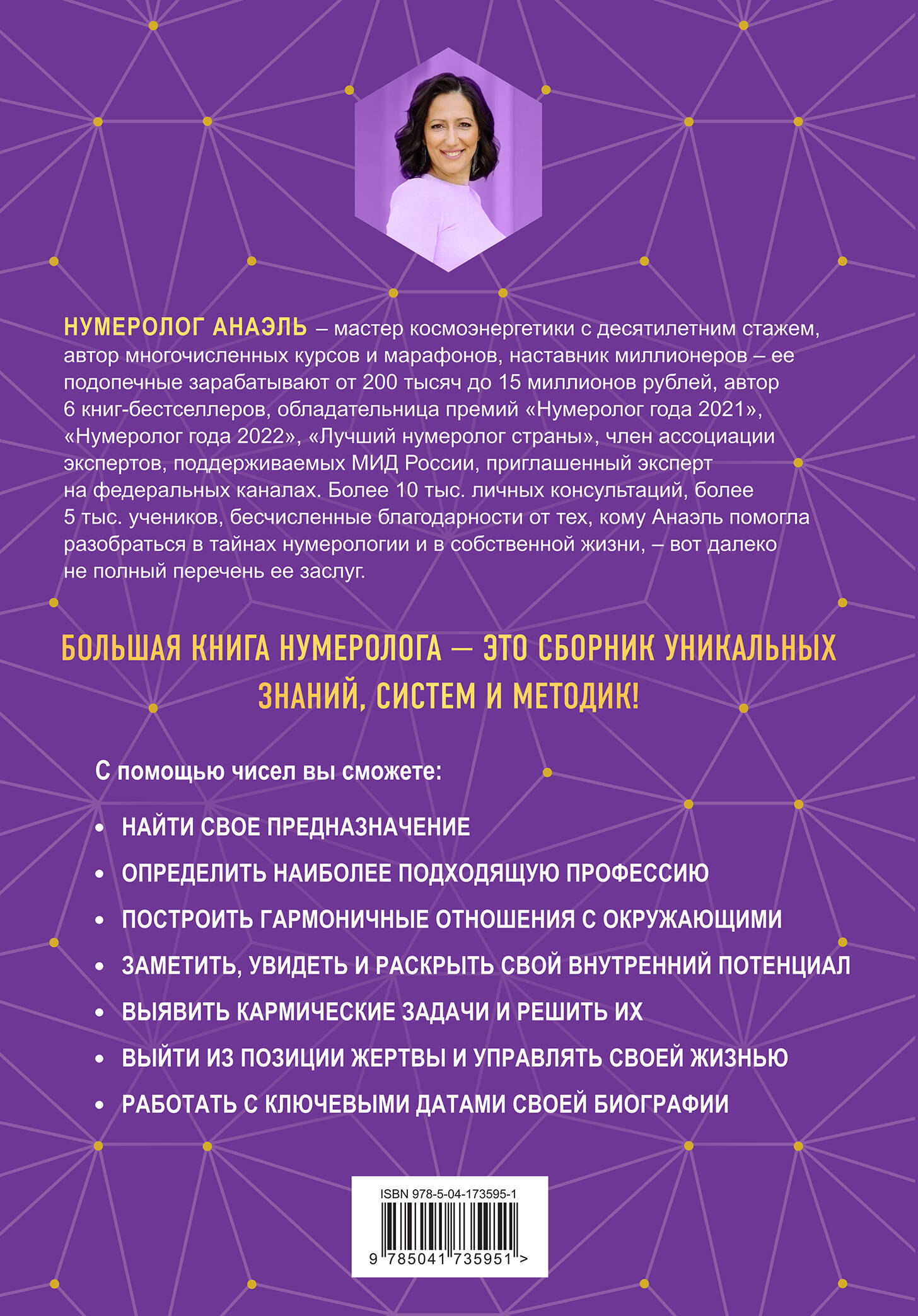 Нумеролог Анаэль - мастер космоэнергетики с десятилетним стажем, автор многочисленных курсов и марафонов, наставник миллионеров - ее подопечные зарабатывают от 200 тысяч до 15 миллионов рублей, автор 6 книг-бестселлеров, обладательница премий: Нумеролог года 2021, Нумеролог года 2022, Лучший нумеролог страны, член ассоциации экспертов, поддерживаемых МИД России, приглашенный эксперт на федеральных каналах. Более 10 тыс. личных консультаций, более 5 тыс. учеников, бесчисленные благодарности от тех, кому Анаэль помогла разобраться в тайнах нумерологии и в собственной жизни, - вот далеко не полный перечень ее заслуг. Большая книга нумеролога - это сборник уникальных знаний, систем и методик. С помощью чисел вы сможете: - Найти свое предназначение. - Определить наиболее подходящую профессию. - Построить гармоничные отношения с окружающими. - Заметить, увидеть и раскрыть свой потенциал. - Выявить кармические задачи и решить их. - Выйти из позиции жертвы и управлять своей жизнью. - Работать с ключевыми датами своей биографии.| Издательство | ООО "Издательство "Эксмо" |