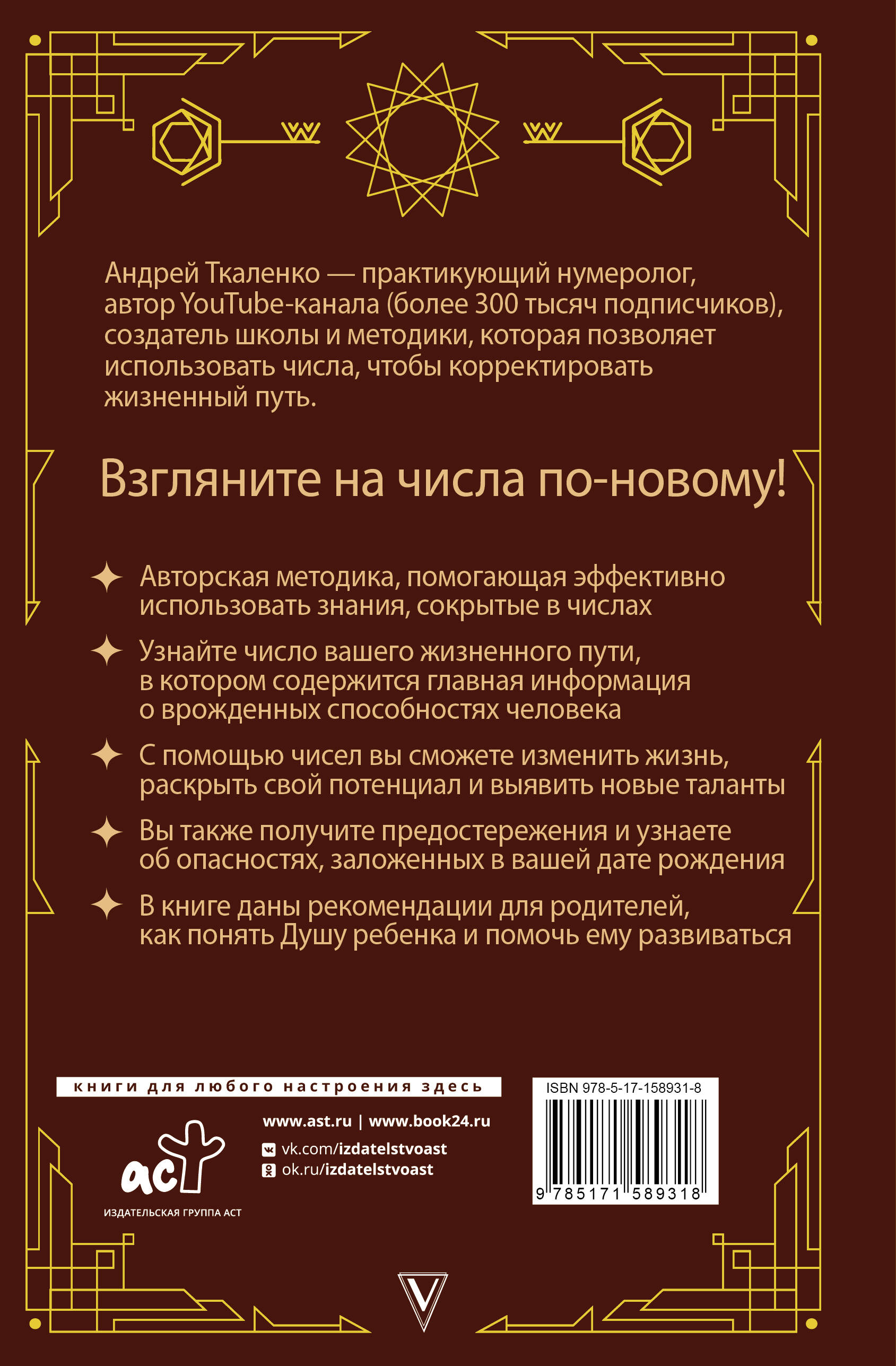 Взгляните на нумерологию по-новому! Теперь вам доступна информация, которая заставит числа работать на вас. Эта книга объяснит смысл даты рождения и то, как она влияет на психологический портрет, ваши способности и судьбу. Вы научитесь рассчитывать число жизненного пути (ЧЖП), которое сопровождает человека на протяжении всей жизни. В этом числе заложена информация о характере, привычках и реакциях человека на происходящие события. Зная свое ЧЖП и его особенности в сочетании с другими датами (день и месяц рождения), вам будет проще выбрать профессиональное направление, приносящее удовольствие и хороший доход, так как в нем заложена информация о врожденных талантах и предпочтительных маршрутах развития. В книге также даны рекомендации для родителей по тому, какие потребности есть у детей с разными кодами рождения. Вся информация основана на практике автора, на реальных историях отношений родителей и детей. Анализируя даты рождения членов семьи, можно выстроить отношения с близкими, понять друг друга и жить полноценной жизнью. Помочь выбрать профессию детям и внукам, научить их жить счастливо. Андрей Ткаленко - практикующий нумеролог, автор YouTube-канала (384 тысячи подписчиков), создатель школы и методики, которая позволяет использовать числа, чтобы корректировать жизненный путь.| Издательство | Издательство "АСТ" |