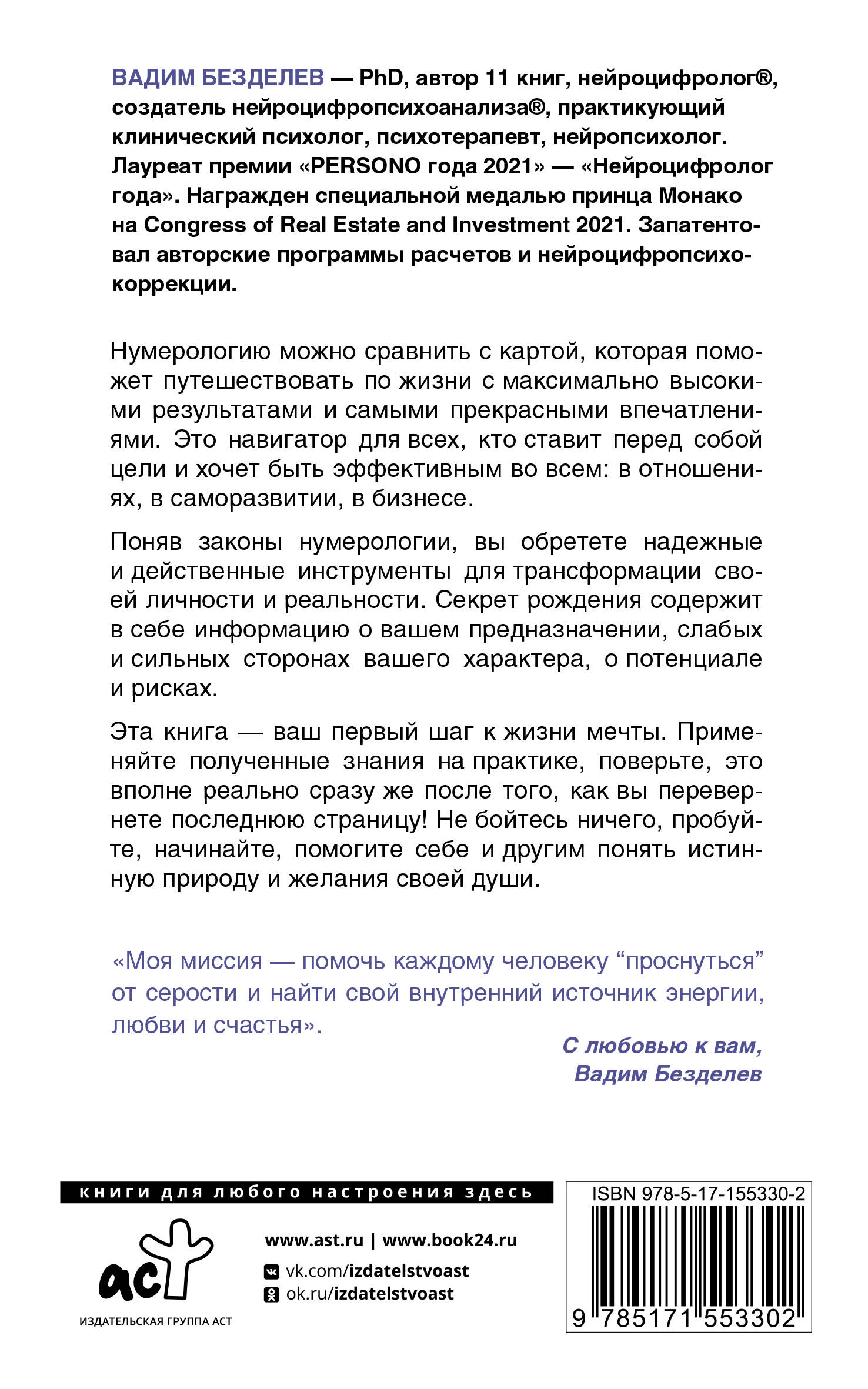 Вадим Безделев - PhD, автор 11 книг, нейроцифролог®, создатель нейроцифропсихоанализа®, практикующий клинический психолог, психотерапевт, нейропсихолог. Лауреат премии "PERSONO года 2021" - "Нейроцифролог года". Награжден специальной медалью принца Монако на Congress of Real Estate and Investment 2021. Запатентовал авторские программы расчетов и нейроцифропсихокоррекции. Нумерологию можно сравнить с картой, которая поможет путешествовать по жизни с максимально высокими результатами и самыми прекрасными впечатлениями. Это навигатор для всех, кто ставит перед собой цели и хочет быть эффективным во всем: в отношениях, в саморазвитии, в бизнесе. Поняв законы нумерологии, вы обретете надежные и действенные инструменты для трансформации своей личности и реальности. Секрет рождения содержит в себе информацию о вашем предназначении, слабых и сильных сторонах вашего характера, о потенциале и рисках. Книга "Нумерология: секреты рождения" - ваш первый шаг к жизни мечты. Применяйте полученные знания на практике, поверьте, это вполне реально сразу же после того, как вы перевернете последнюю страницу! Не бойтесь ничего, пробуйте, начинайте, помогите себе и другим понять истинную природу и желания своей души.| Издательство | ИЗДАТЕЛЬСТВО "АСТ" |