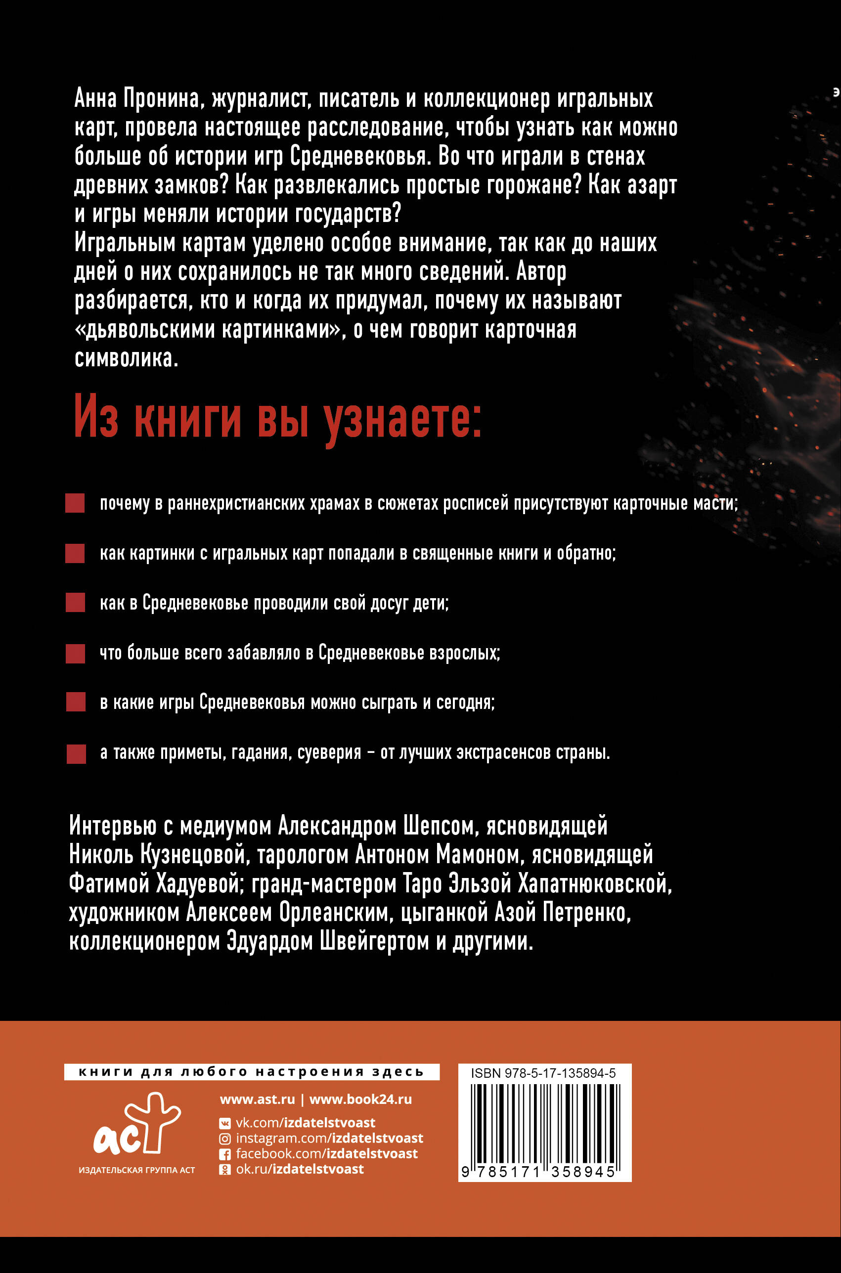 Анна Пронина - журналист, который больше 15 лет исследует мистические явления, загадочные места планеты и людей со сверхъестественными способностями. Автор провела настоящее расследование, чтобы узнать как можно больше об истории игр Средневековья. Во что играли в стенах древних замков? Как развлекались простые горожане? Как азарт и игры меняли истории государств? Игральным картам уделено особо внимание, так как до наших дней о них сохранилось не так много сведений. Автор разбирается, кто и когда их придумал, почему их называют «дьявольскими картинками», о чем говорит карточная символика. Из книги вы узнаете: почему в раннехристианских храмах в сюжетах росписей присутствуют карточные масти; как картинки с игральных карт попадали в священные книги и обратно; как в Средневековье проводили свой досуг дети; что больше всего забавляло в Средневековье взрослых; в какие игры Средневековья можно и сыграть и сегодня; а также: приметы, гадания, суеверия - от лучших экстрасенсов страны.| Издательство | ИЗДАТЕЛЬСТВО "АСТ" |