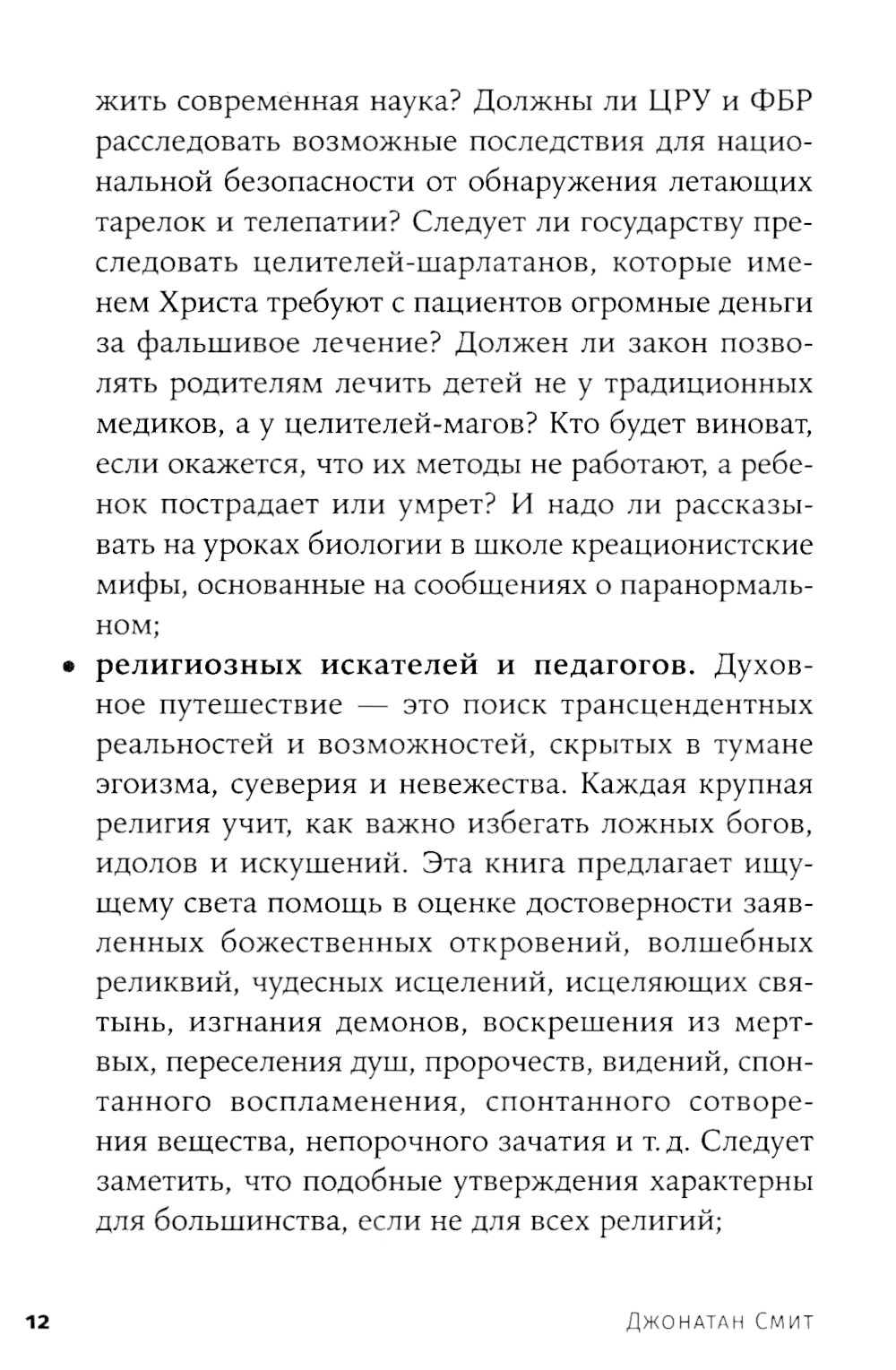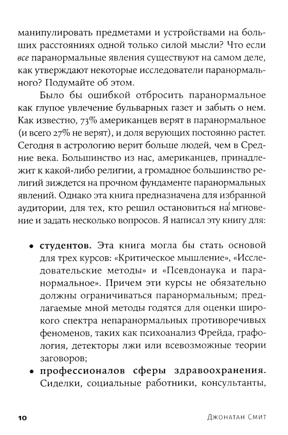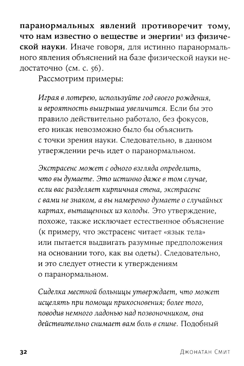 Уверенно оперируя данными психологии, физики, логического анализа, истории, Джонатан Смит ведет читателя по таинственным территориям непознанного, не давая потеряться среди сложных научных понятий и помогая различать невероятную правду и правдоподобный обман. Особенности - Клинический психолог, профессор психологии Джонатан Смит - квалифицированный борец с затуманиванием мозгов. Книга без проблем обучит навыкам критического мышления и объективной оценки явлений, которые считают паранормальными. - Вы сможете узнать, что стоит за огромным числом необычных, необъяснимых или просто противоречивых явлений - начиная с библейских чудес и заканчивая биоэнергетическими методами лечения. - Возможность быть ближе к истине дается посредством альтернативного мнения - в противовес телевизионным продюсерам (которые зарабатывают деньги на экшене) и «зомбиящику», полного байек про НЛО, приведений и т.п., очевидно поддерживающего в обществе всеобщую социальную шизофрению.| Издательство | Альпина нон-фикшн |