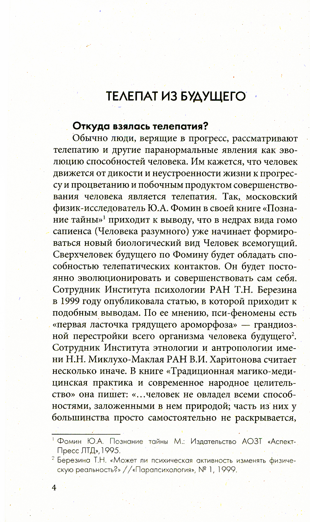 В этой книге Александра Белова рассказывается о телепатии и ясновидении, а также о прочих феноменах, наличие которых отрицается ортодоксальной наукой. Эти феномены не только существуют, но их давно используют секретные службы разных стран и военные. Обычные люди практически ничего не знают об этом в силу того, что тема паранормальных явлений является секретной по сей день. В широкую печать просачиваются лишь некоторые сведения о грандиозных научных экспериментах, которые тут же объявляются газетными утками и домыслами «шаловливых» журналистов. Между тем феномены телепатии и ясновидения не только скрупулезно изучаются во многих лабораториях мира, но и используются в режиме полной секретности.| Издательство | Амрита-Русь |