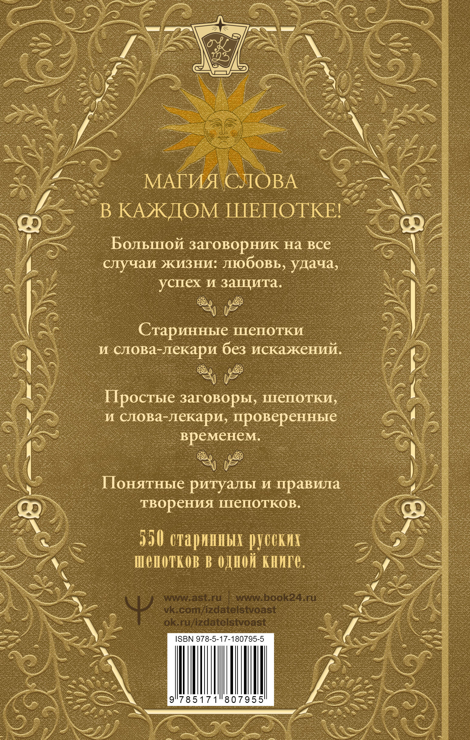 Перед вами полная книга русских шепотков - 550 старинных нашептываний на все случаи жизни! Шепоток - это древний метод наговора, особая форма заклинания, в основе которой - тихое слово, идущее от самого сердца и обладающее огромной силой. С его помощью создавали мощные обереги, выстраивали защиту от любого зла и привлекали в свою жизнь желаемое. В этой книге собраны сотни проверенных временем заговоров. Вы найдете: • шепотки на примирение, верность и укрепление семейных уз; • нашептывания, привлекающие денежный поток, успех и удачу; • сильные обереги от дурного сглаза и любого негатива; • добрые слова, которые помогут найти работу и улучшить настроение. Шепотки - это живая народная магия, простая и доступная каждому. Наши предки знали: тихое слово, сказанное от сердца, обладает огромной энергией. Не нужно особых приготовлений - только вера, искренность и сила родного слова.| Издательство | Издательство "АСТ" |