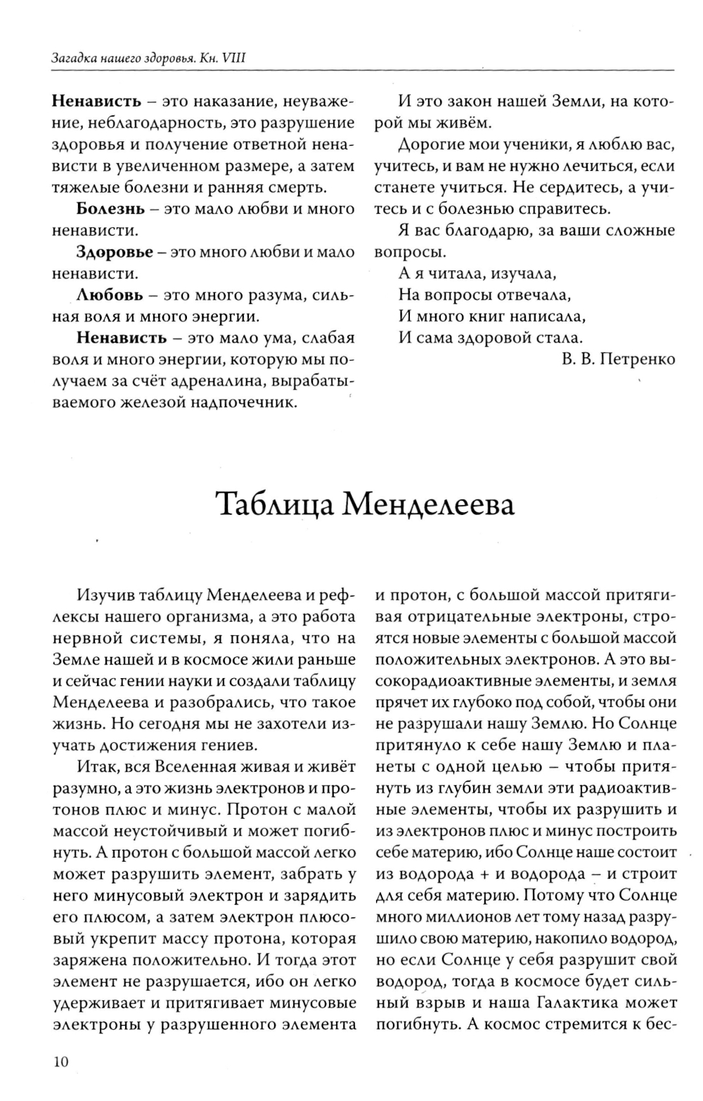 В этой книге Валентина Петренко и Евгений Дерюгин объясняют, каковы причины заболеваний человека и как можно бороться с ними народными средствами. По мнению авторов, нашему выздоровлению (как физическому, так и духовному) способствует влияние мысли, а точнее, сознания и подсознания. Взяв их под контроль, мы сможем избавиться от любых недугов. В книге можно найти размышления о связи таблицы Менделеева с законами Земли и Космоса и о том, как воздействует эта связь на жизнь и счастье каждого из нас. Советы В. Петренко и Е. Дерюгина помогут не только избавиться от болезней, но и поддерживать своё здоровье на протяжении многих лет.| Издательство | Амрита-Русь |